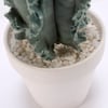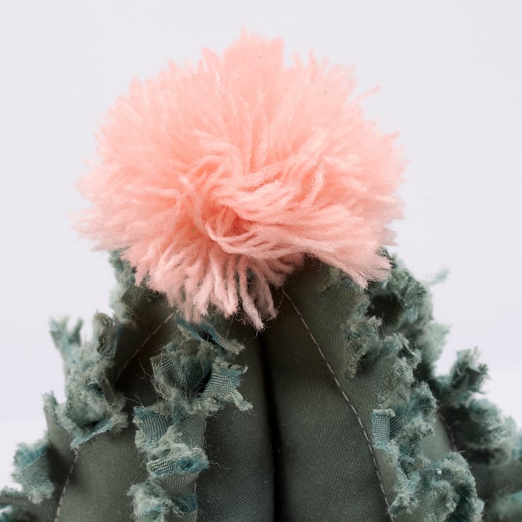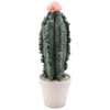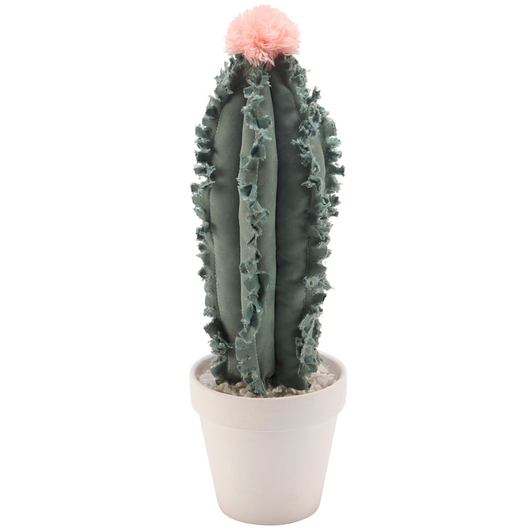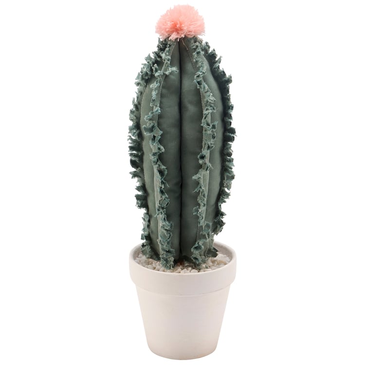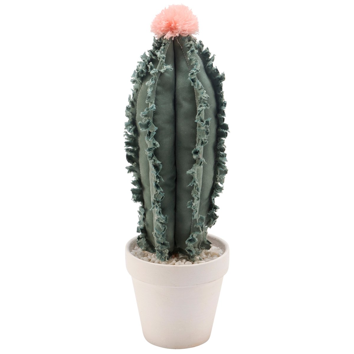A decorative sitter from our Western Collection displaying a potted barrel cactus design with a handmade craft style. Cactus sitter features a painted clay pot holding a columnar cactus made from stuffed textured cotton with frayed trim and a pink pom accent on top resembling a flower. Our Columnar Cactus sitter is designed to free-stand on a flat surface making it easy to display. A western home accent that can easily be displayed in any home or work space.