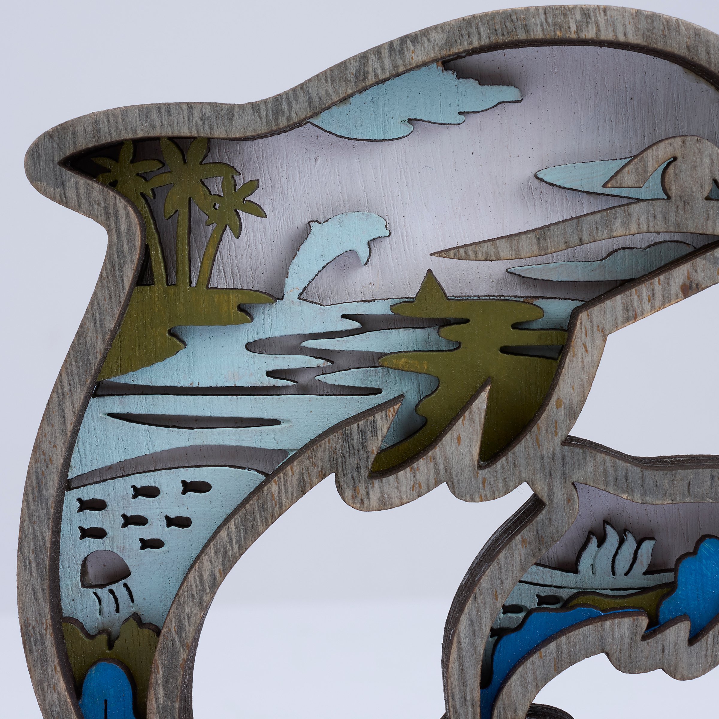 A wooden sitter from our Beach Collection featuring a jumping dolphins shape cut from natural wood with beach and ocean scenes displayed inside that are made with layered cutouts of colored wood pieces for added dimension. Our Dolphin sitter is designed to free stand on flat surface for display. A beach home accent that can be easily displayed in any home or work space.