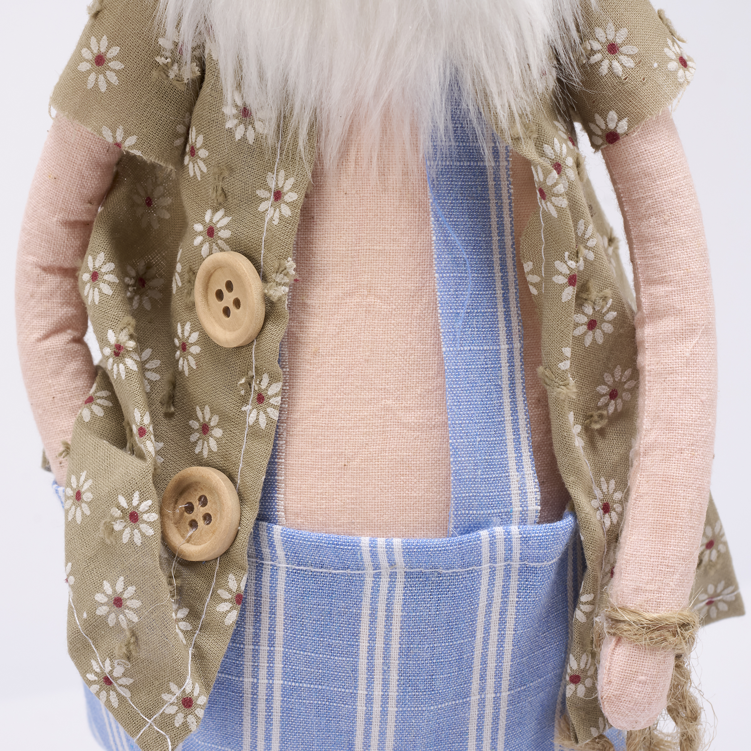 A character sitter from our Beach Collection displaying a fun fisherman design in a handmade style. Fisherman design features fabric clothing with long beard detail and holding a felt cutout of a fish on a jute fishing line. Perfect to display on its own or with coordinating beach decor. Our Fisherman sitter is designed to free-stand on any flat surface making it easy to display. A fun beach-themed home accent with a variety of display options.