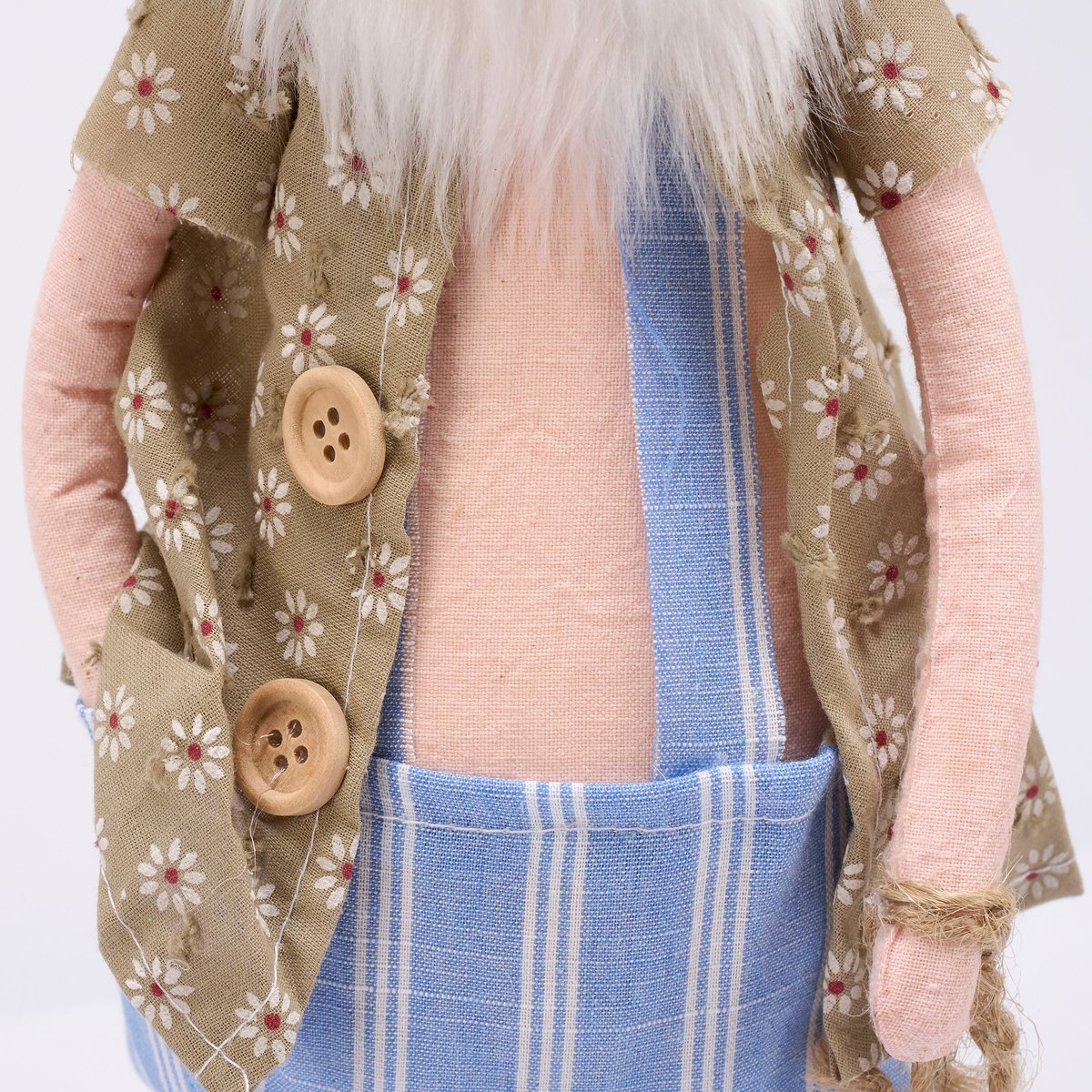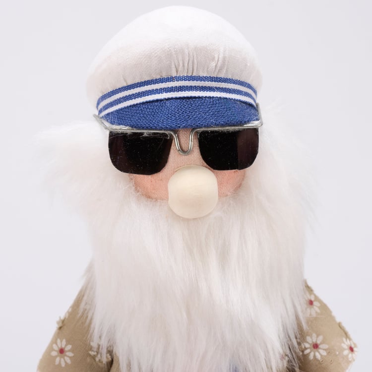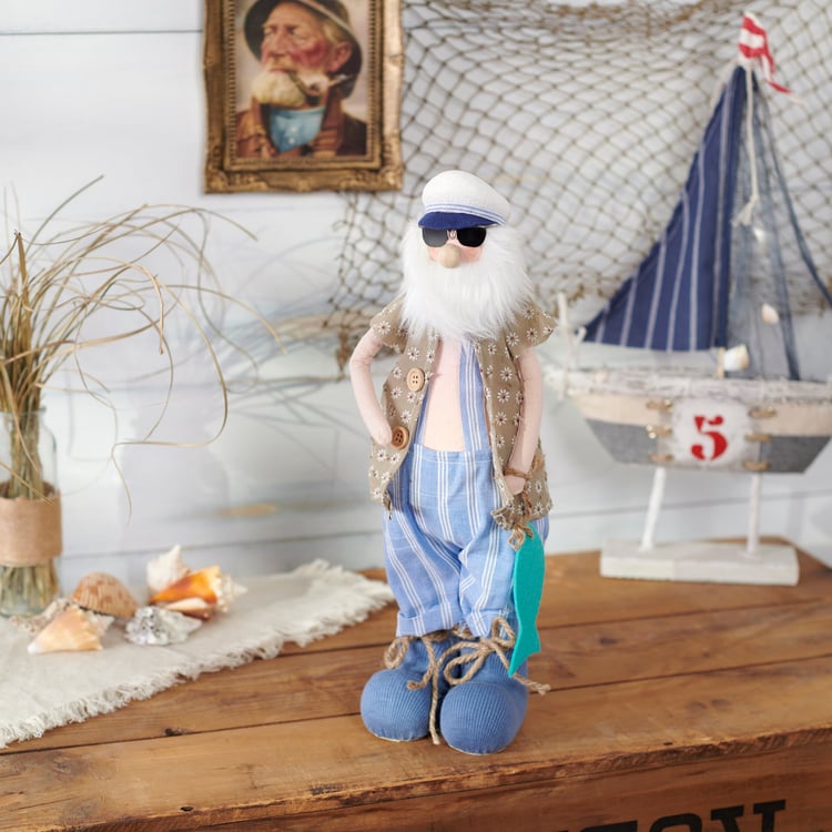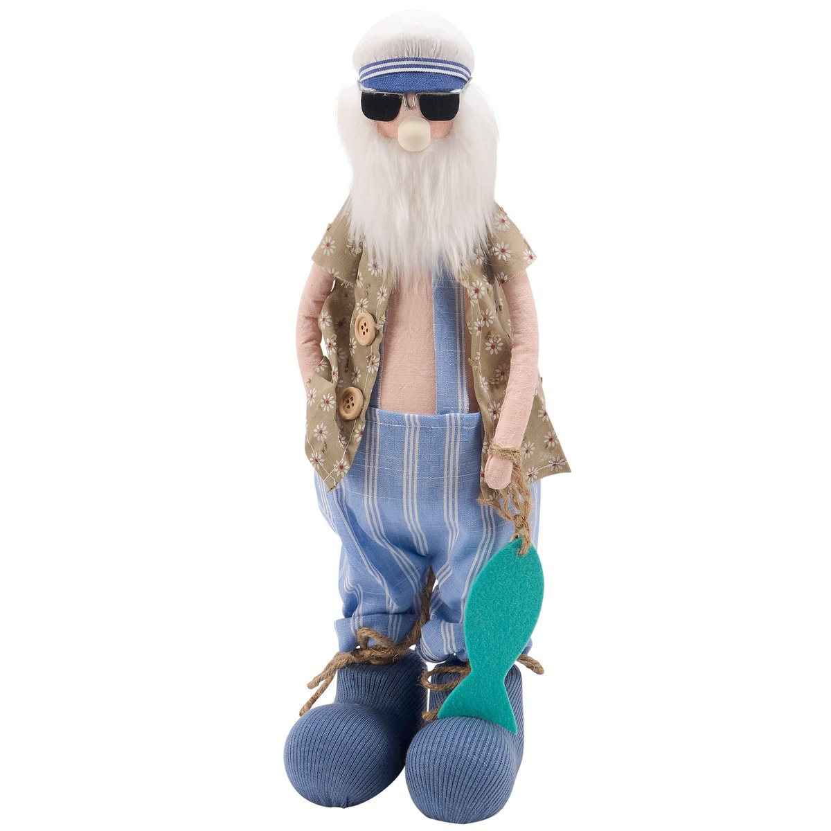 A character sitter from our Beach Collection displaying a fun fisherman design in a handmade style. Fisherman design features fabric clothing with long beard detail and holding a felt cutout of a fish on a jute fishing line. Perfect to display on its own or with coordinating beach decor. Our Fisherman sitter is designed to free-stand on any flat surface making it easy to display. A fun beach-themed home accent with a variety of display options.
