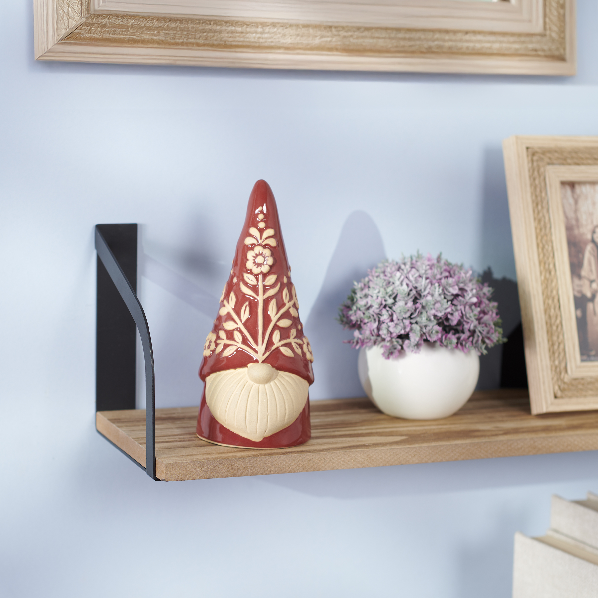 A ceramic sitter from out Folk Art Collection displaying a gnome design with embossed florals on the hat inspired by folk art. Gnome features red glaze with raw ceramic accents. Our Folk Gnome sitter is designed to free-stand on any flat surface making it easy to display. A rustic gnome-themed home accent with a variety of display options.
