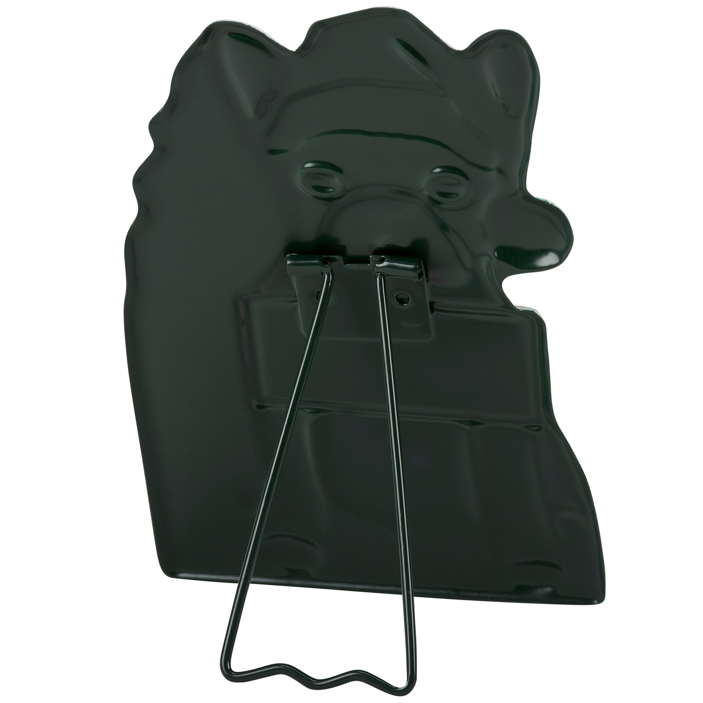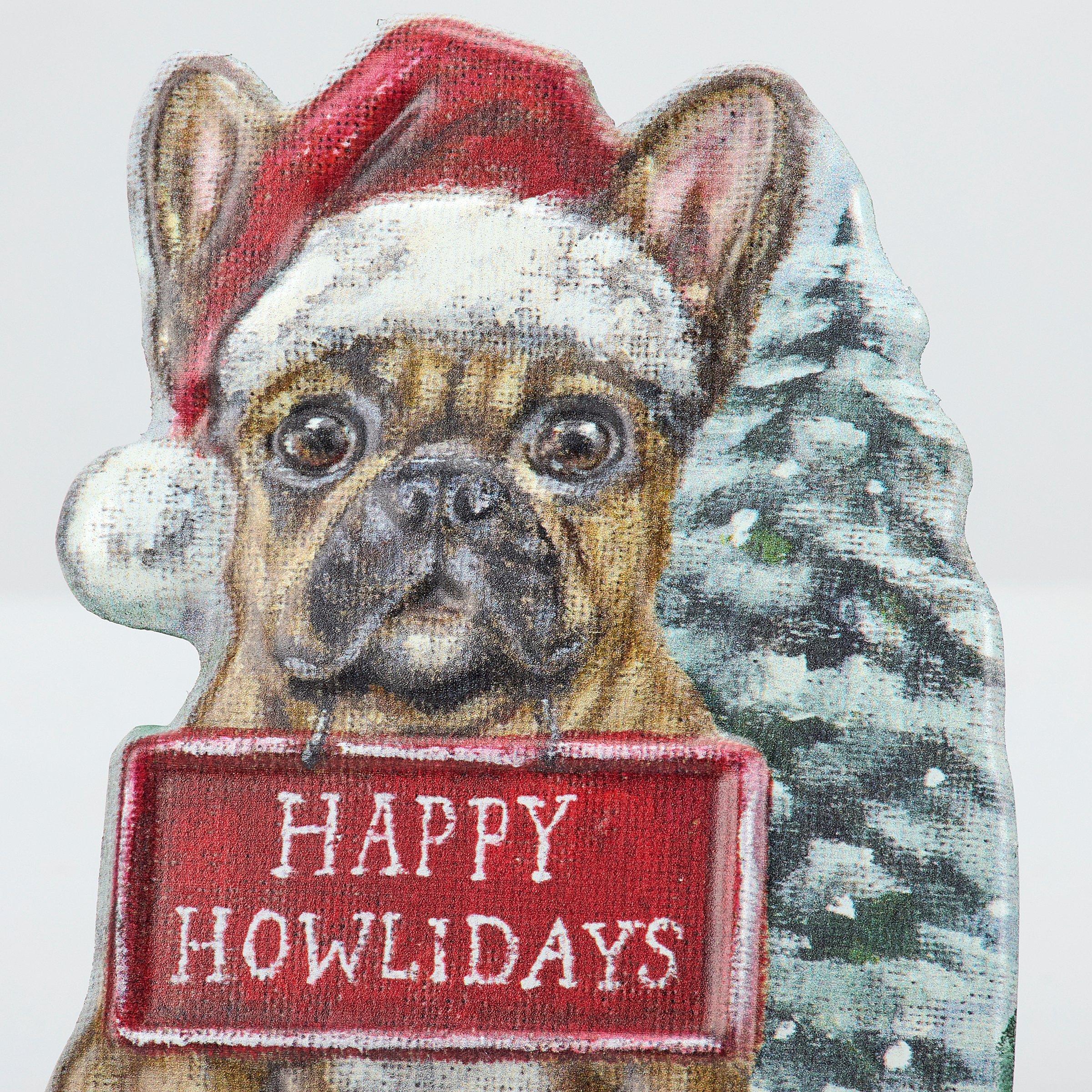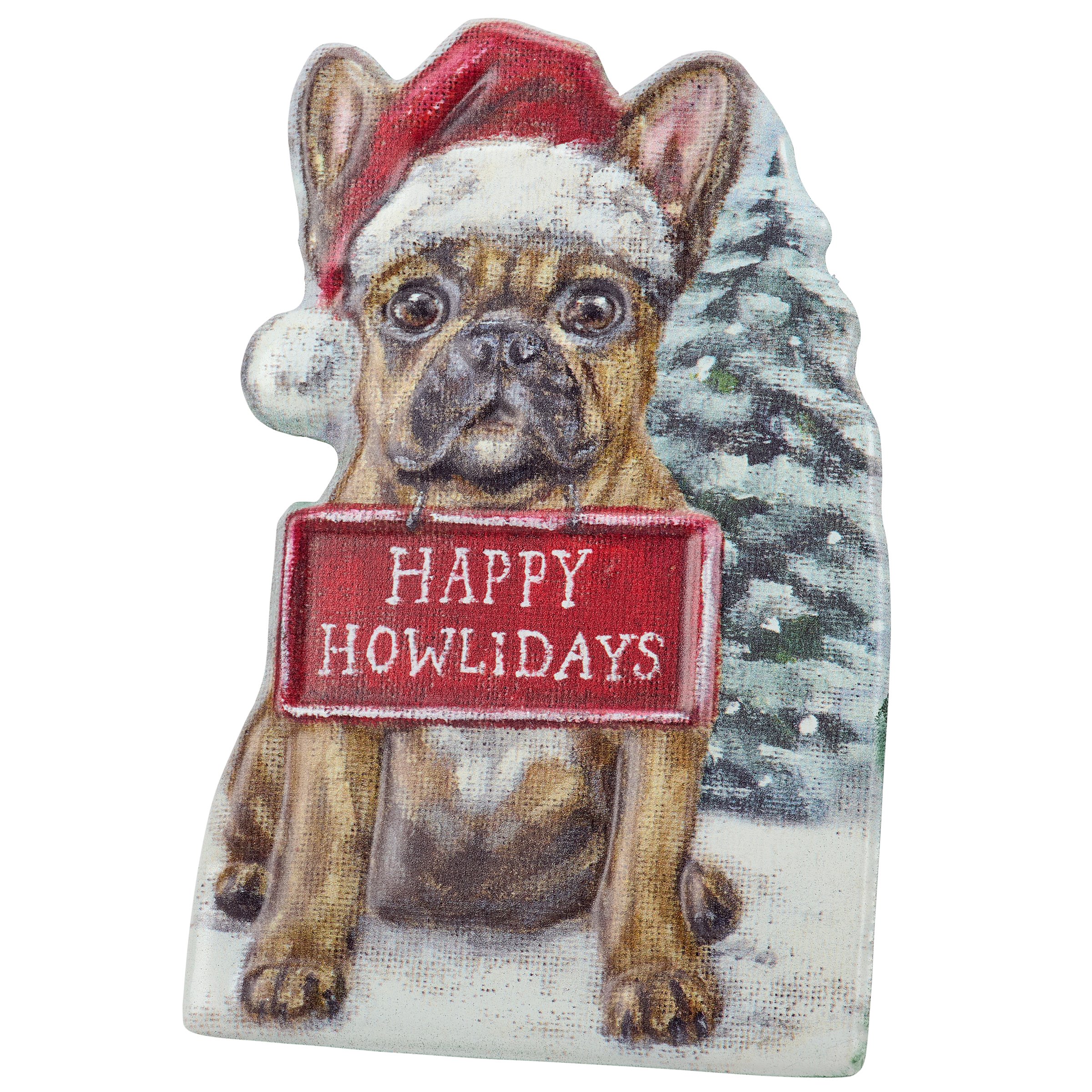 A metal sitter from our Holiday Pet Collection featuring a cutout design displaying a charming winter scene of a Frenchie dog wearing a Santa hat and holding a sign that reads "Happy Howlidays" for a fun combination of a love for Christmas and pets. Christmas Frenchie design is replicated from original artwork painted onto burlap canvas, giving the art a unique depth and texture. This Christmas dog sitter features embossed and debossed details to accent the original hand painted art for added dimension. Our metal Frenchie Happy Howlidays sitter free stands on flat surface for display using easel on the back. A fun dog themed home accent that easily adds seasonal style to any home or work space.