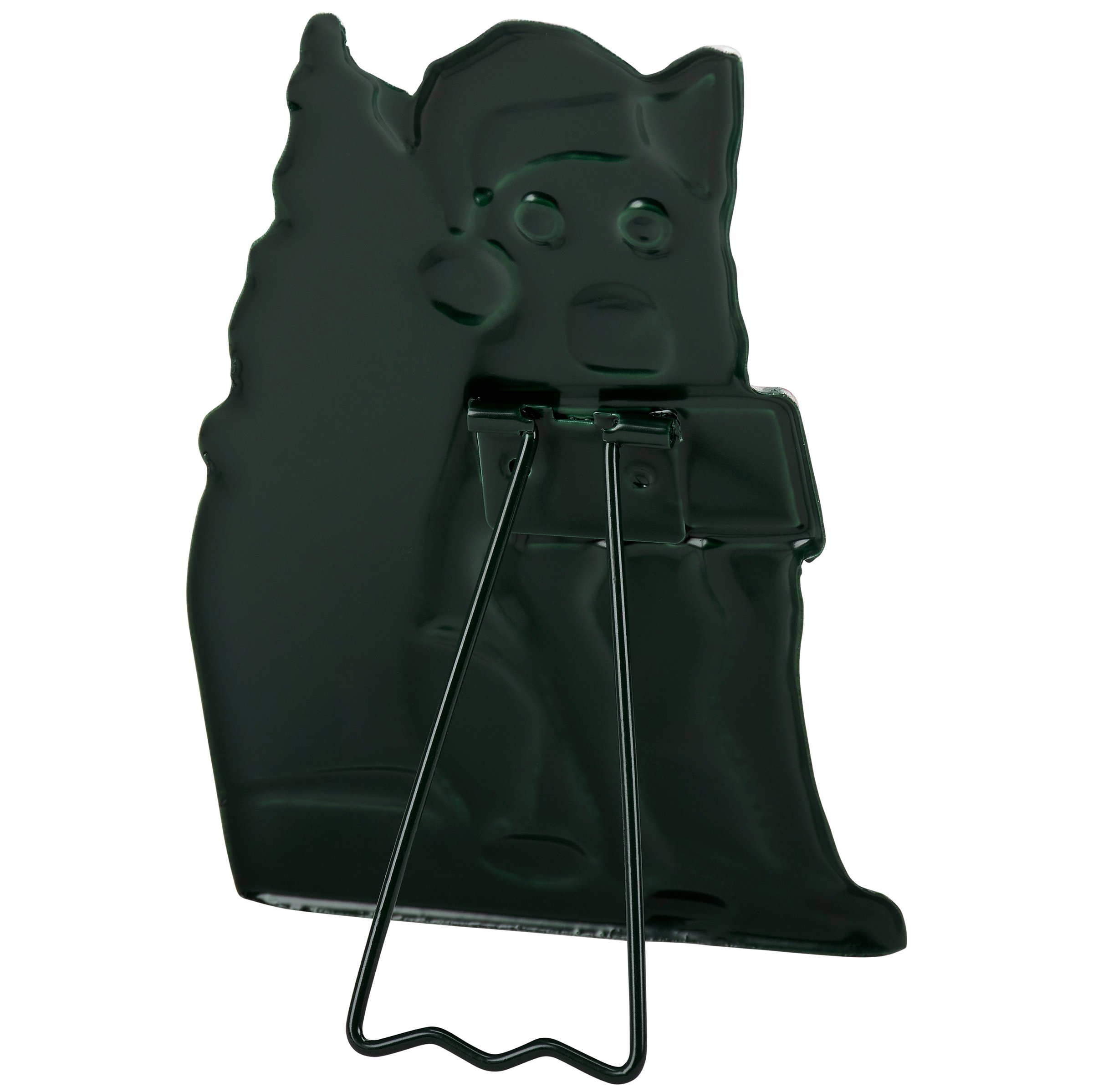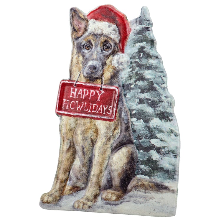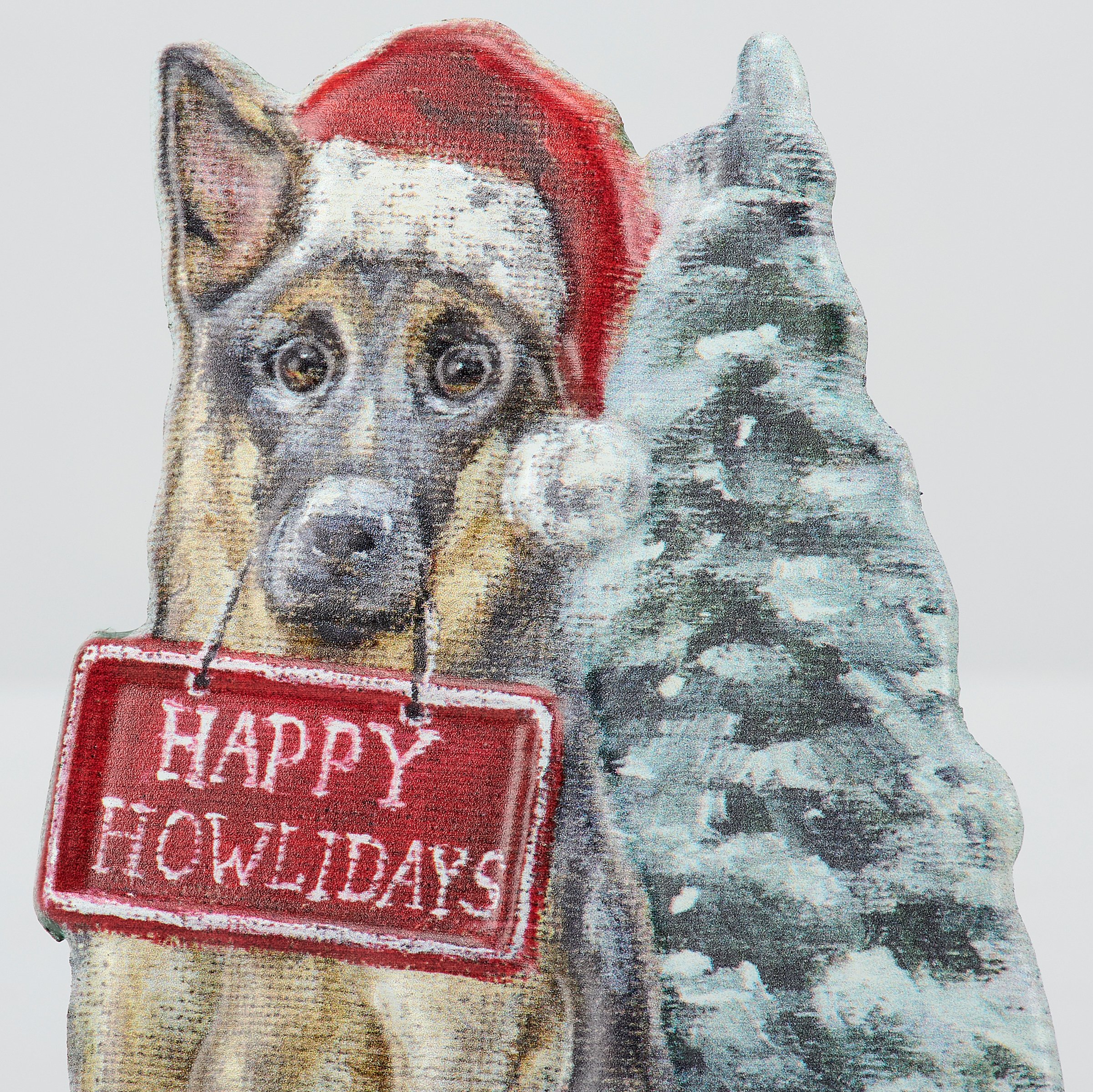 A metal sitter from our Holiday Pet Collection featuring a cutout design displaying a charming winter scene of a German shepherd dog wearing a Santa hat and holding a sign that reads "Happy Howlidays" for a fun combination of a love for Christmas and pets. Christmas German shepherd design is replicated from original artwork painted onto burlap canvas, giving the art a unique depth and texture. This Christmas dog sitter features embossed and debossed details to accent the original hand painted art for added dimension. Our metal German Shepherd Happy Howlidays sitter free stands on flat surface for display using easel on the back. A fun dog themed home accent that easily adds seasonal style to any home or work space.