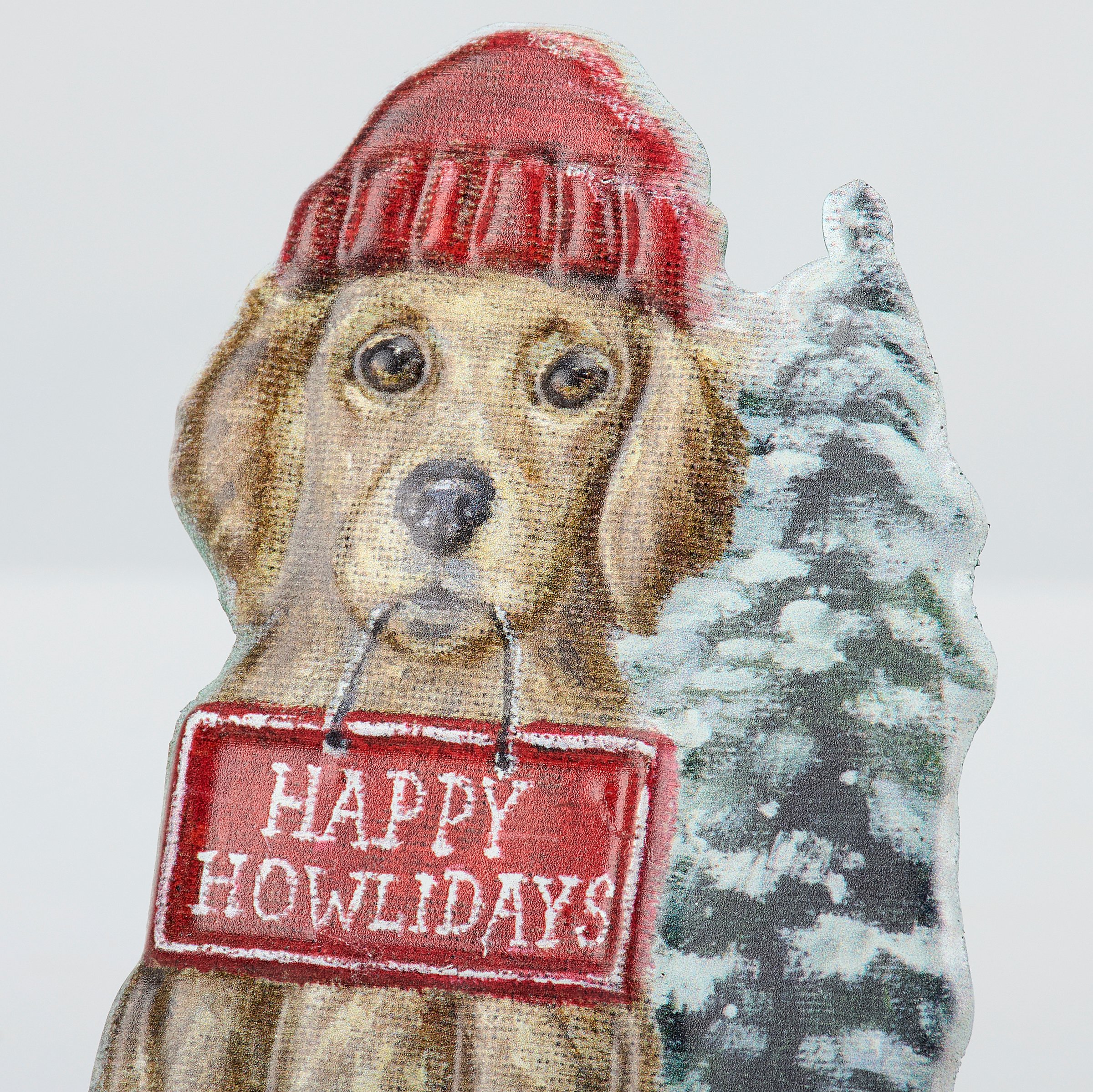 A metal sitter from our Holiday Pet Collection featuring a cutout design displaying a charming winter scene of a golden retriever wearing a winter hat and holding a sign that reads "Happy Howlidays" for a fun combination of a love for Christmas and pets. Christmas golden retriever design is replicated from original artwork painted onto burlap canvas, giving the art a unique depth and texture. This Christmas dog sitter features embossed and debossed details to accent the original hand painted art for added dimension. Our metal Golden Retriever Happy Howlidays sitter free stands on flat surface for display using easel on the back. A fun dog themed home accent that easily adds seasonal style to any home or work space.