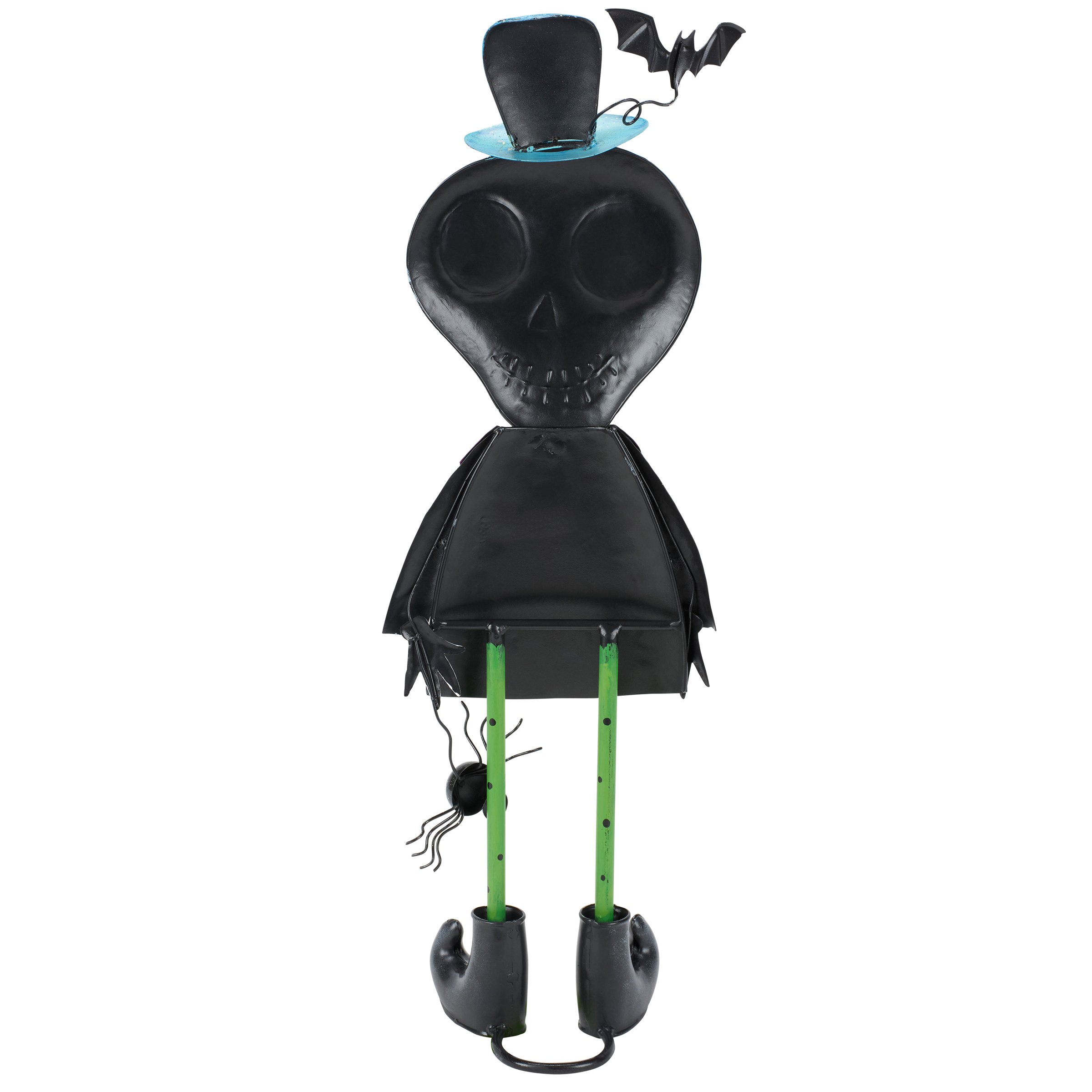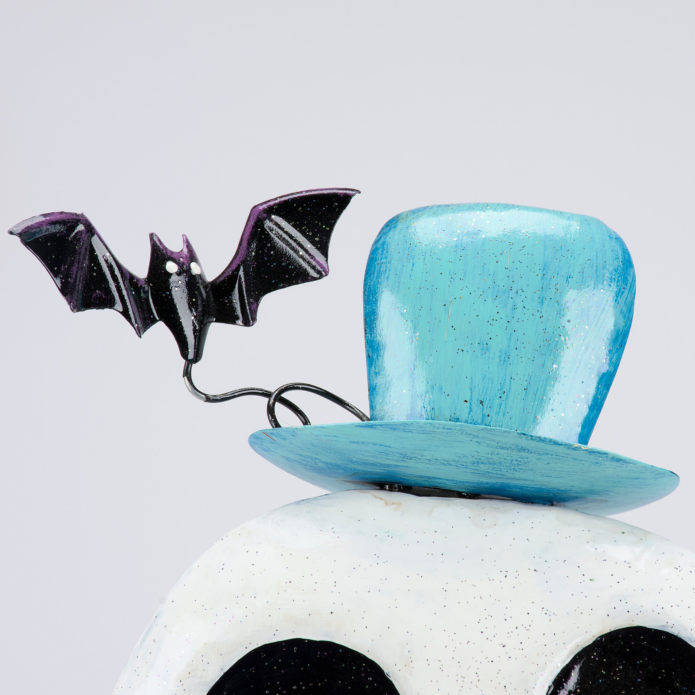 A metal art piece from our Halloween Collection displaying a whimsical skeleton character design made with colorful painted metal pieces for a handmade aesthetic. Halloween skeleton features a bat on metal wire attached to the hat for a floating appearance and a spider hanging from its hand as well as glitter accents throughout. Our Happy Skeleton sitter is designed to free stand on flat surface for display. A whimsical Halloween home accent that easily adds seasonal style to any home or work space.