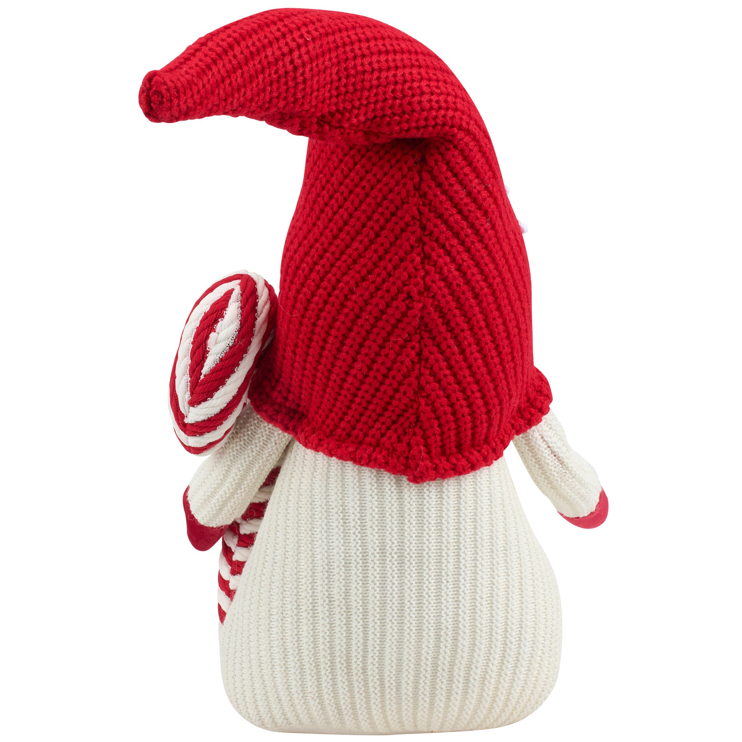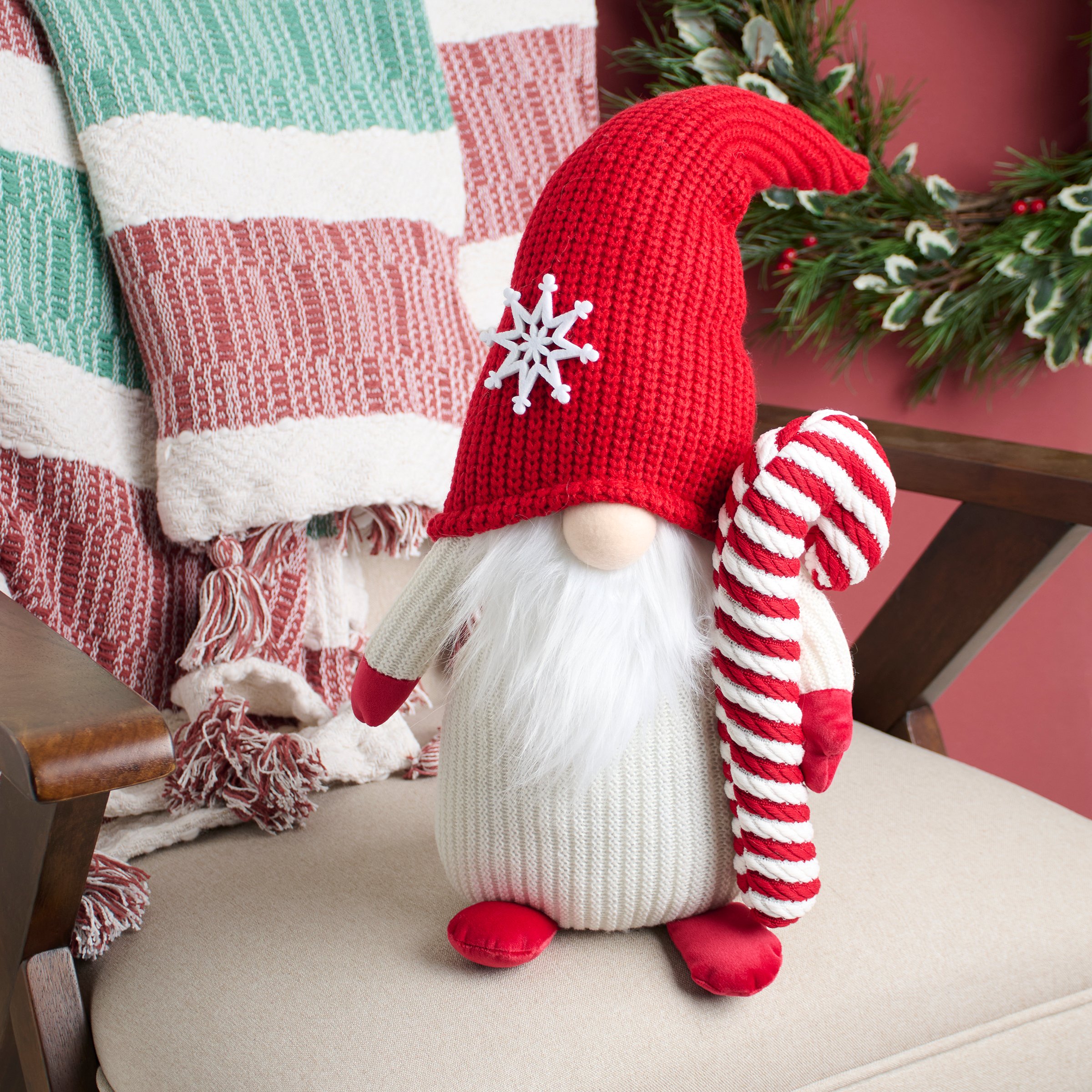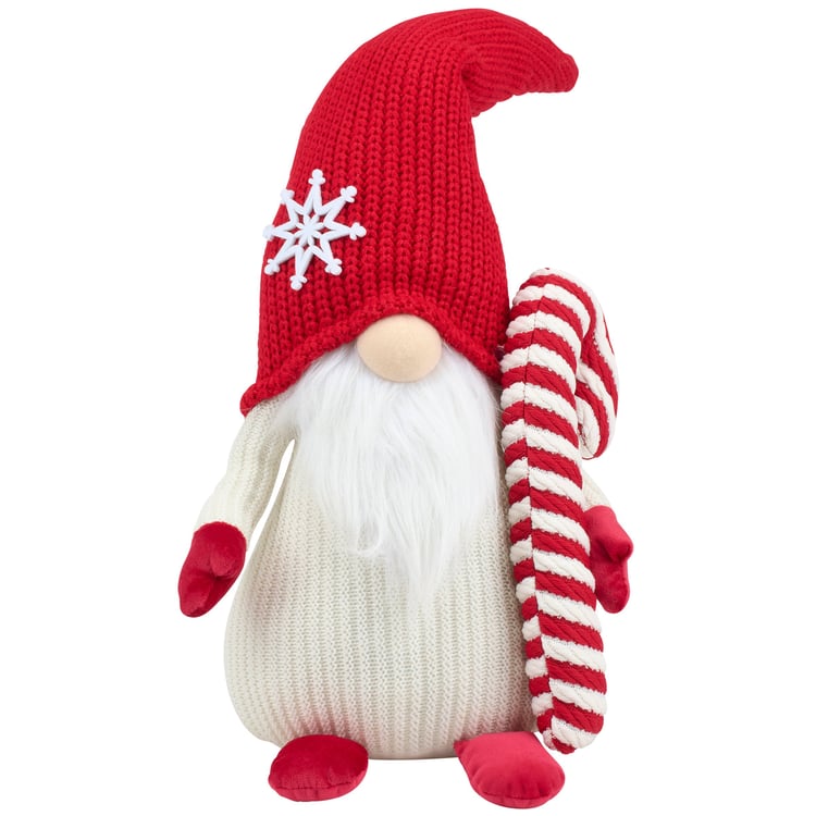 A sitter from our Christmas Collection displaying a winter gnome design. Gnome features knit winter clothes and a large candy cane in its hand. Perfect to display on its own or with a collection of decorative gnomes. Our Knitted Gnome sitter is weighted with sand to free-stand on a flat surface for display. For decorative use only; not a toy. A gnome themed Christmas home accent that easily adds seasonal style to any home or work space.