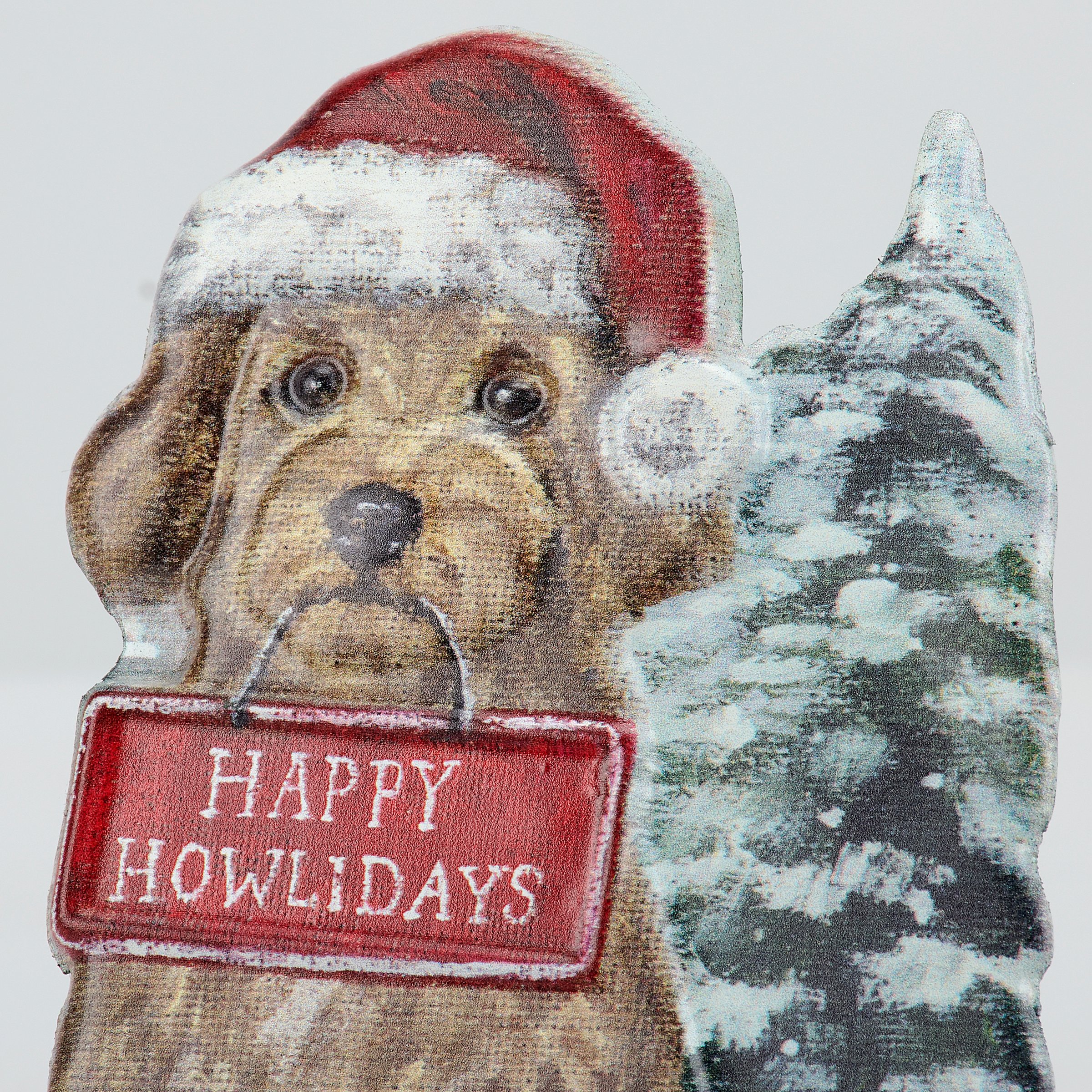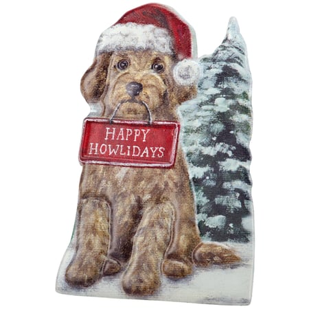 A metal sitter from our Holiday Pet Collection featuring a cutout design displaying a charming winter scene of a labradoodle wearing a Santa hat and holding a sign that reads "Happy Howlidays" for a fun combination of a love for Christmas and pets. Christmas labradoodle design is replicated from original artwork painted onto burlap canvas, giving the art a unique depth and texture. This Christmas dog sitter features embossed and debossed details to accent the original hand painted art for added dimension. Our metal Labradoodle Happy Howlidays sitter free stands on flat surface for display using easel on the back. A fun dog themed home accent that easily adds seasonal style to any home or work space.