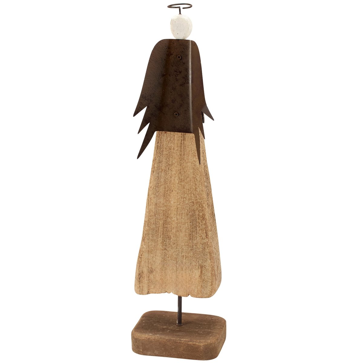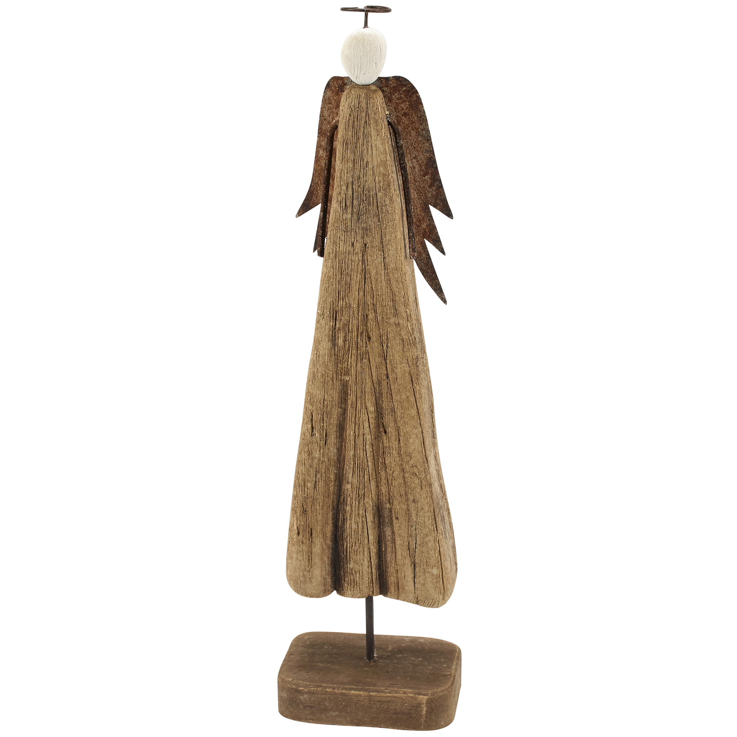 A decorative angel sitter from our Christmas Collection displaying a handmade inspired design made of natural wood with painted accents and distressed details. Decorative angel features aged metal wings and sits on a metal stake attached to a wood base for a floating appearance. Our large Angel sitter is designed to free-stand on a flat surface making it easy to display. A rustic Christmas home accent that coordinates well with primitive home décor.