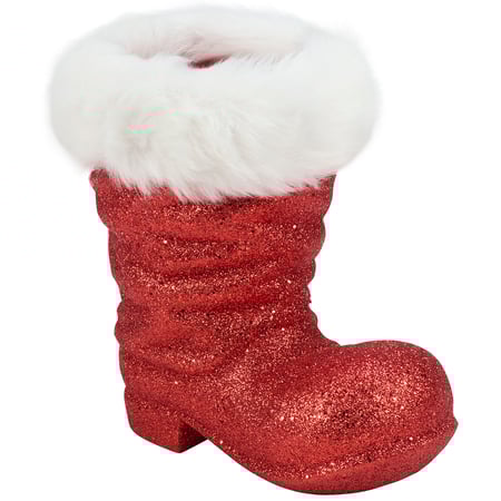 A large decorative sitter from our Christmas Collection displaying a sculpted Santa boot design with red glitter finish and white fur trim for added interest. Our large Glitter Santa Boot is designed to free-stand on a flat surface for easy display. A fun retro Christmas home accent that can be easily displayed in any home or work space.
