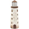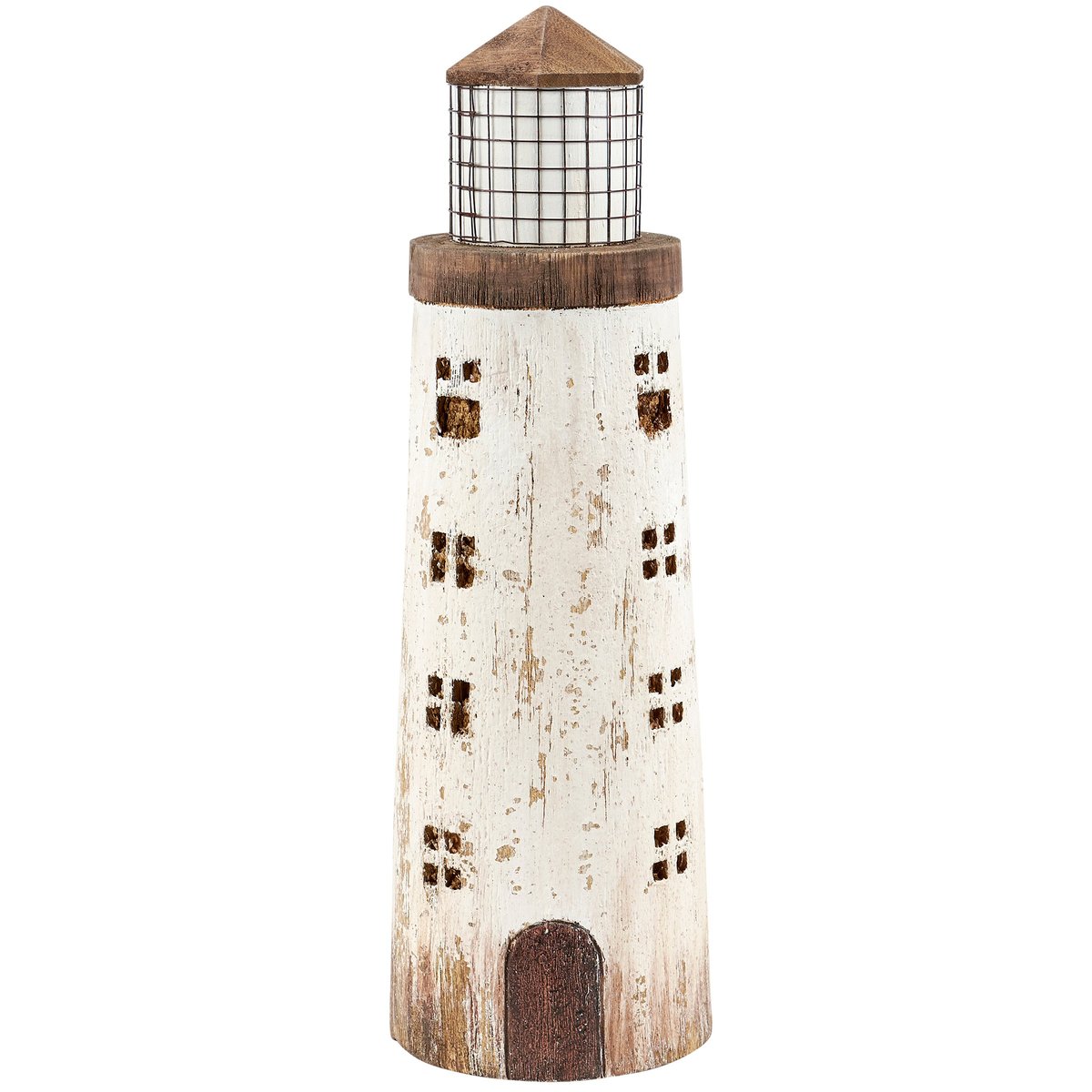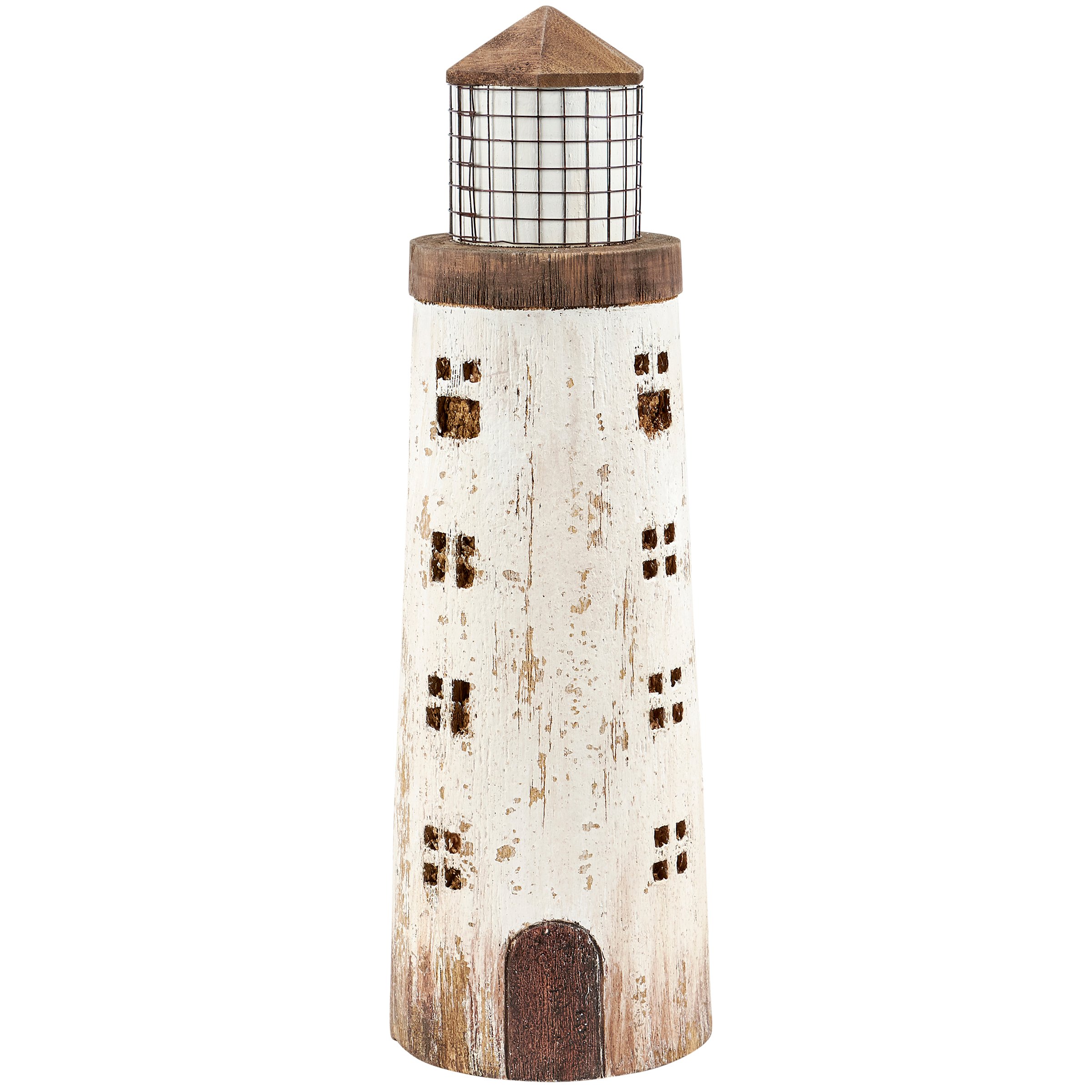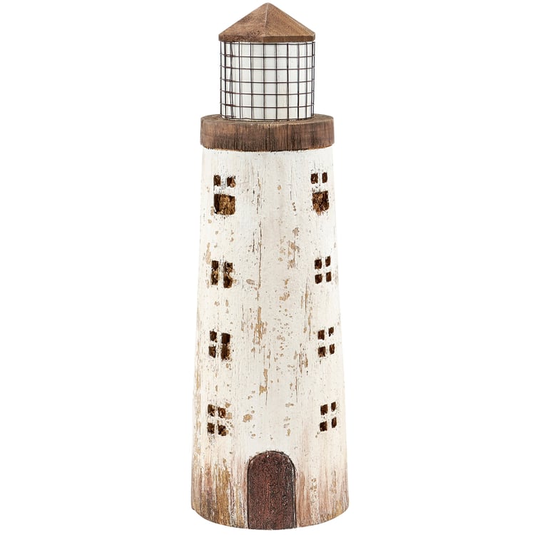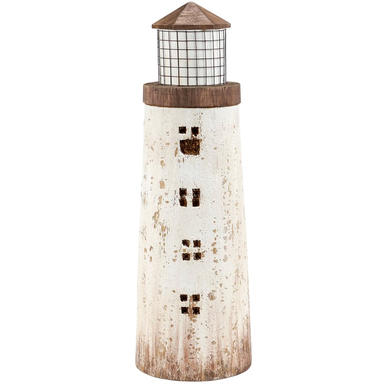A large decorative lighthouse from our Beach Collection displaying a driftwood inspired design made of natural wood with painted accents and distressed details. Decorative lighthouse features aged metal for the door and light cage. Our large Lighthouse sitter is designed to free-stand on any flat surface making it easy to display. A rustic beach-themed home accent that coordinates well with primitive home décor.