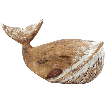 A large decorative whale from our Beach Collection displaying a driftwood inspired design made of natural wood with white painted accents and distressed details. Decorative white whale features aged metal for the fins and eyes. Our large White Whale sitter is designed to free-stand on any flat surface making it easy to display. A rustic beach-themed home accent that coordinates well with primitive home décor.