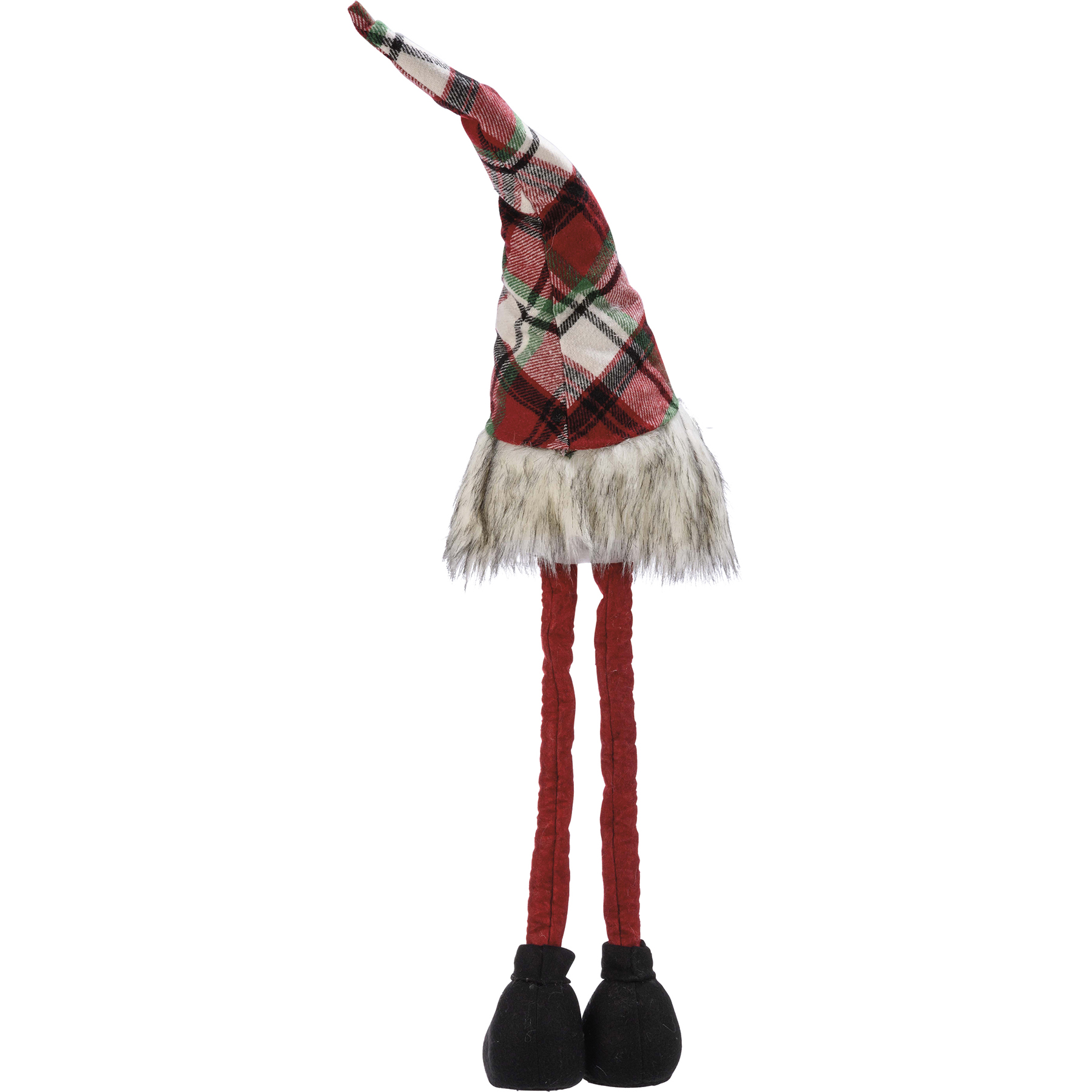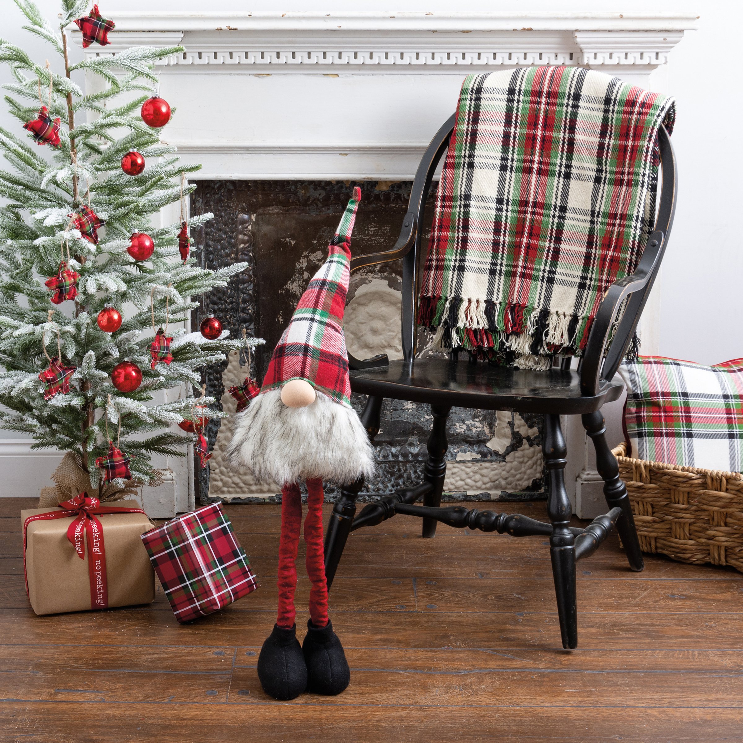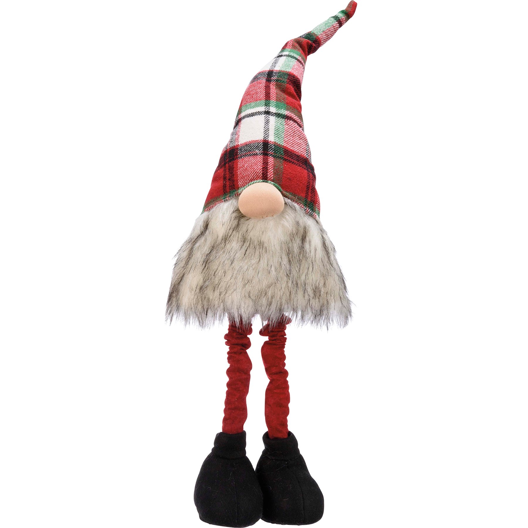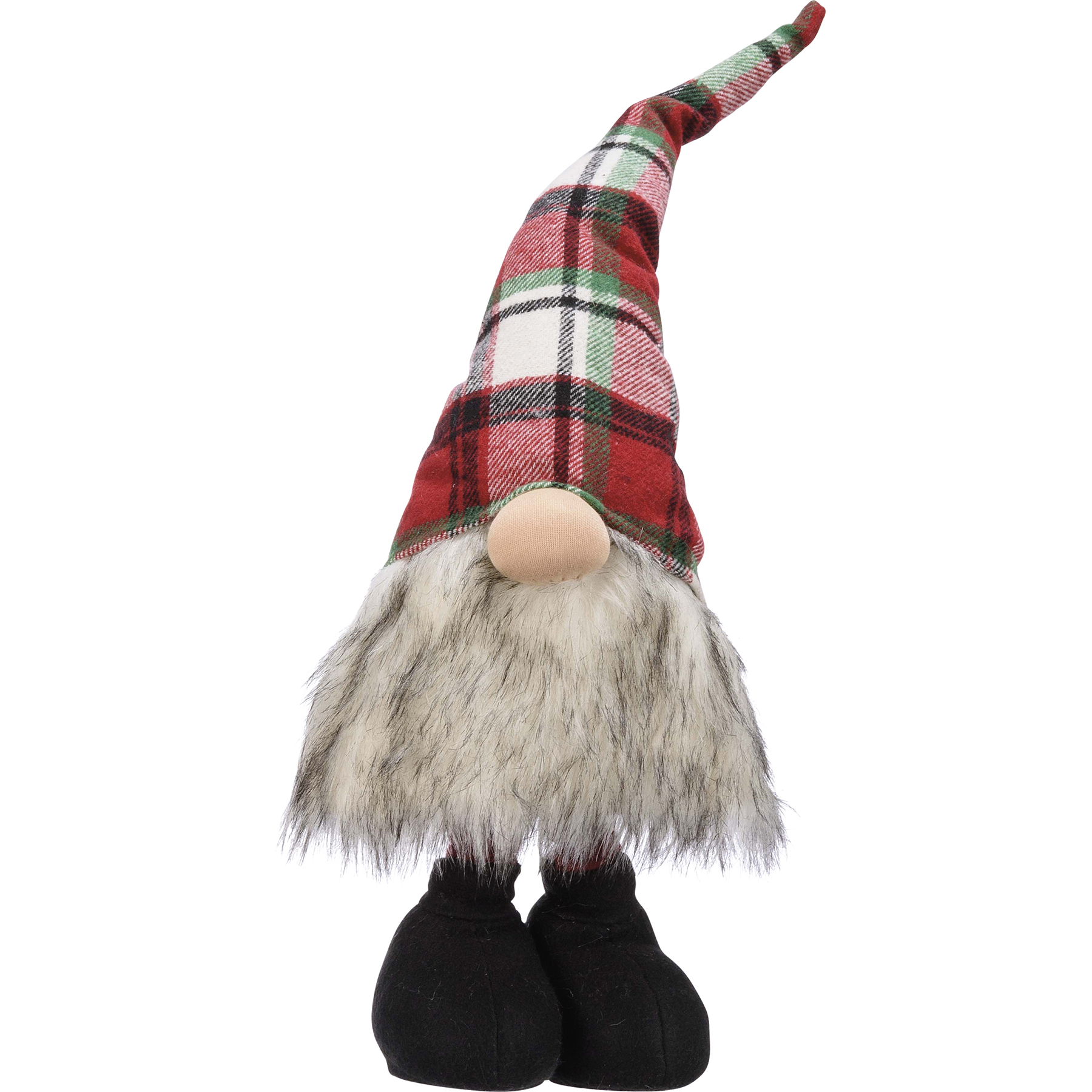 A large standing gnome featuring a red, green, and white plaid color palette. Gnome includes fluffy beard detail and fabric nose for added interest. Retractable legs allow gnome to adjust from 24-32" tall. Pairs well with other holiday plaid items for a cohesive Christmas display.