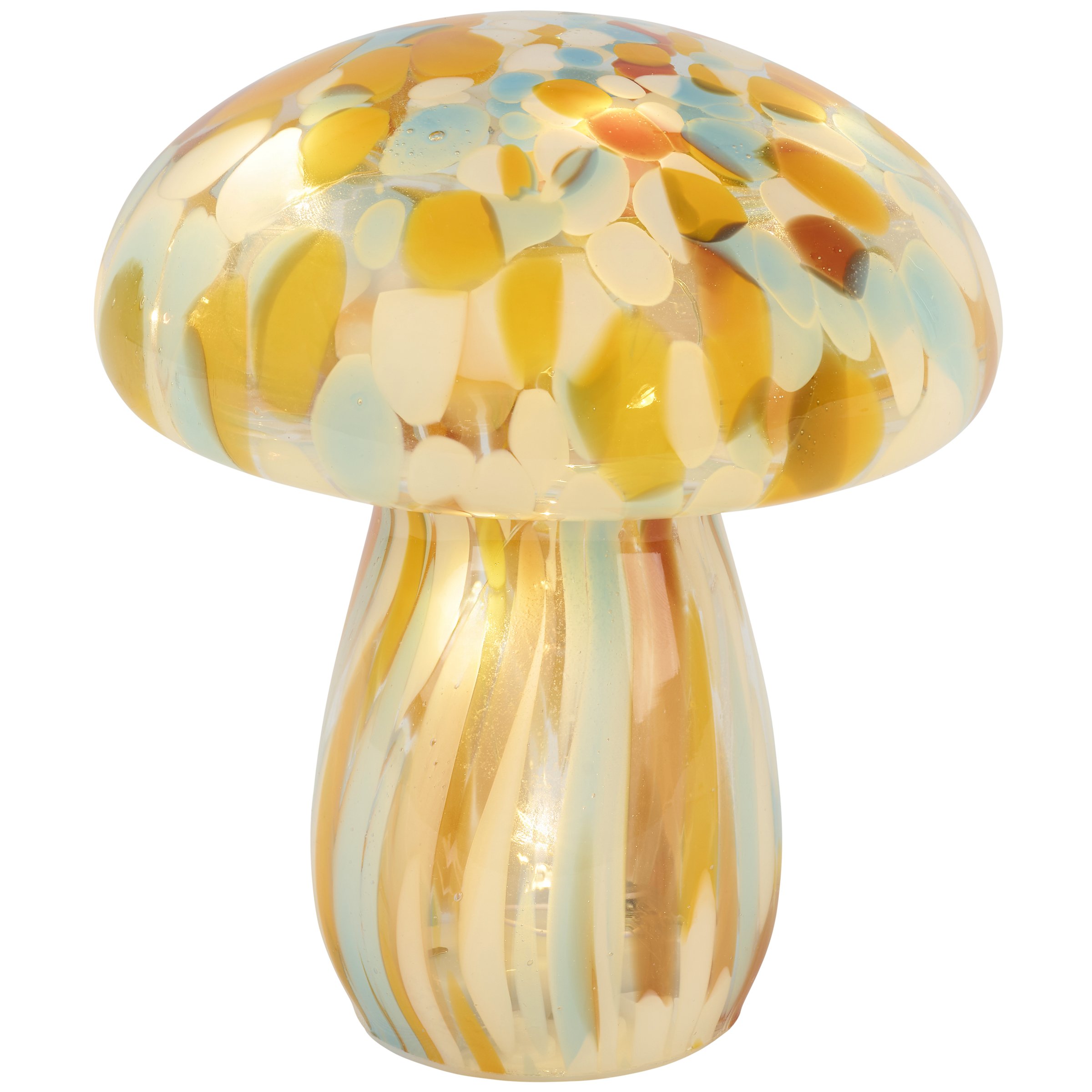 Add stylish mood lighting to any space with our lighted glass sitters featuring a mushroom inspired design for an earthy vibe. This lighted sitter displays a sculpted mushroom design in brown glass with colored swirl accents and wire lights inside. Our lighted Brown Swirl Mushroom sitter includes a convenient 6-hour timer powered by 2 AAA batteries (not included).