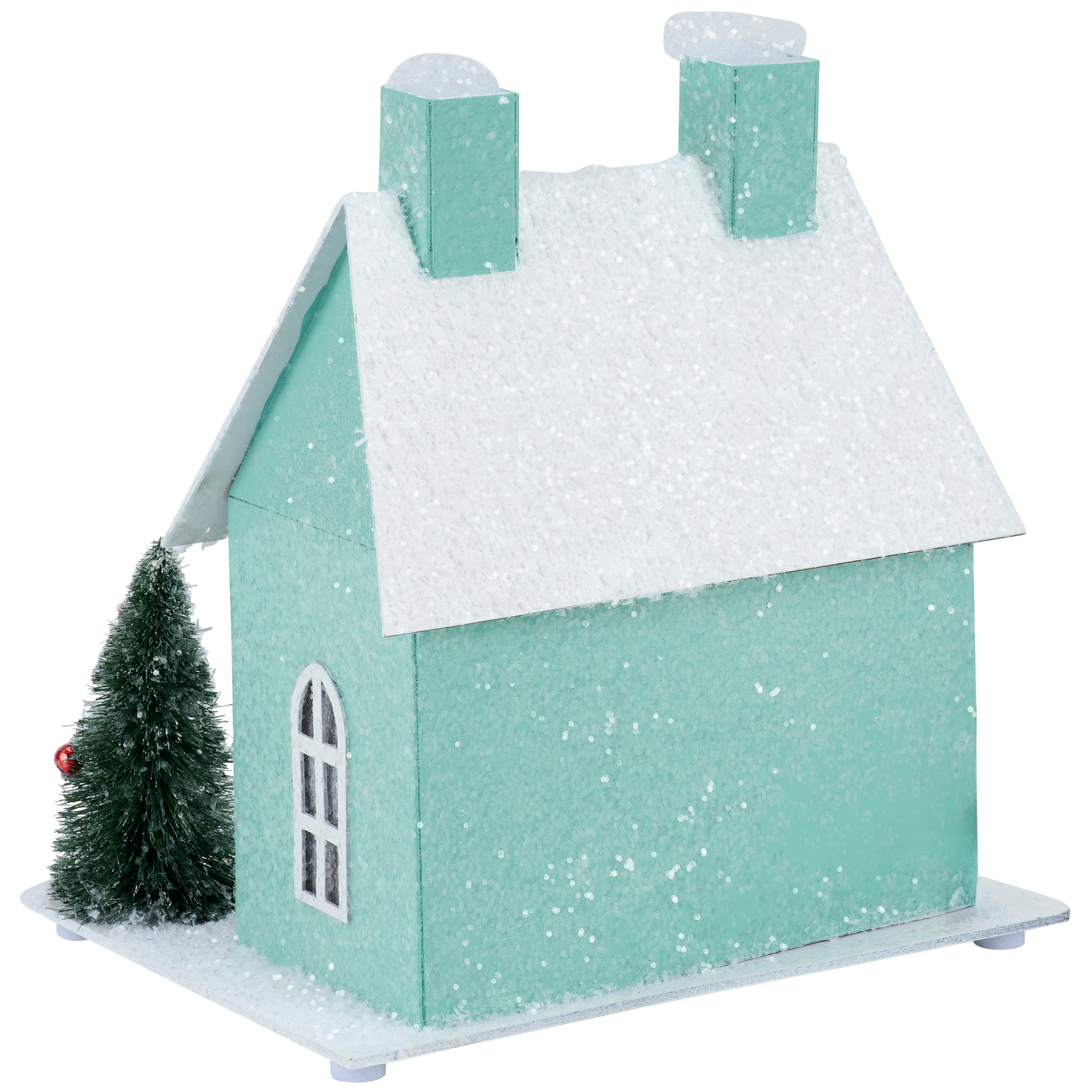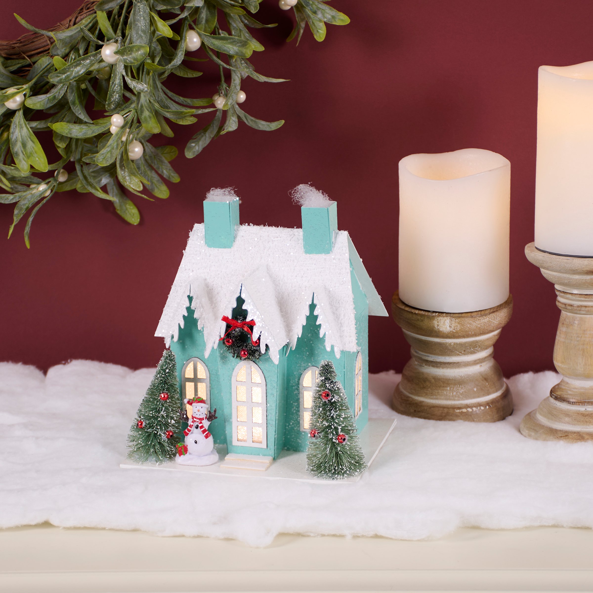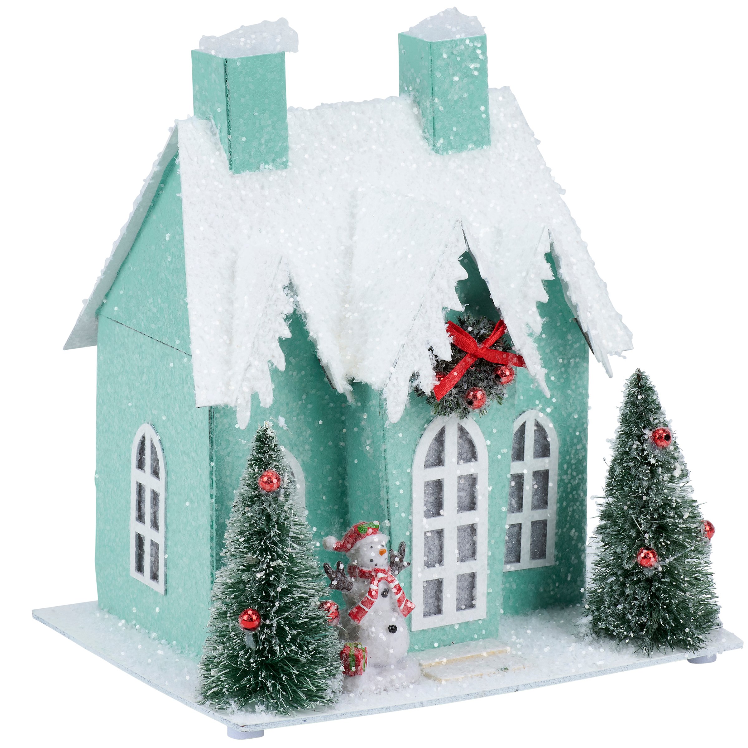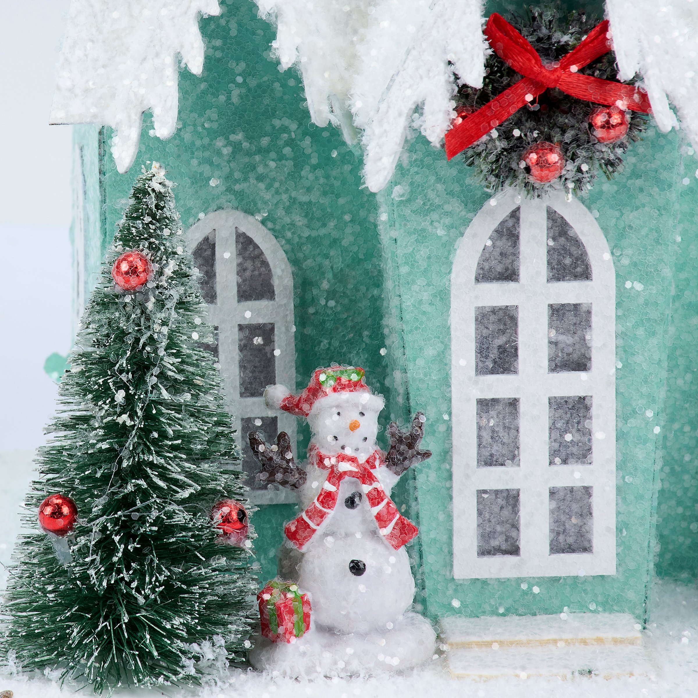 A decorative sitter from our Christmas Collection displaying a winter pastel green house design with bottle brush trees and wreath as well as a miniature snowman and mica detail for a snowy effect. Winter house sitter features a light source inside that illuminates the windows and door powered by 3 AAA batteries (not included). Our Lighted Snowman House sitter is designed to free stand on flat surface for display. A winter themed home accent perfect for adding seasonal lighting to any home or work space.