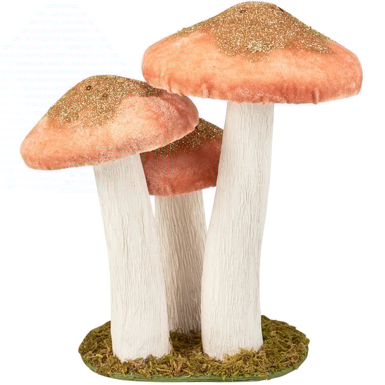 A decorative sitter from our Fall & Harvest Collection displaying a trio of pink mushrooms with unique details. Mushroom design features velvet and glitter accents with natural foliage detail on the base. Our Mushroom Trio sitter is designed to free-stand on flat surface for easy display. A nature-themed home accent perfect for seasonal display.