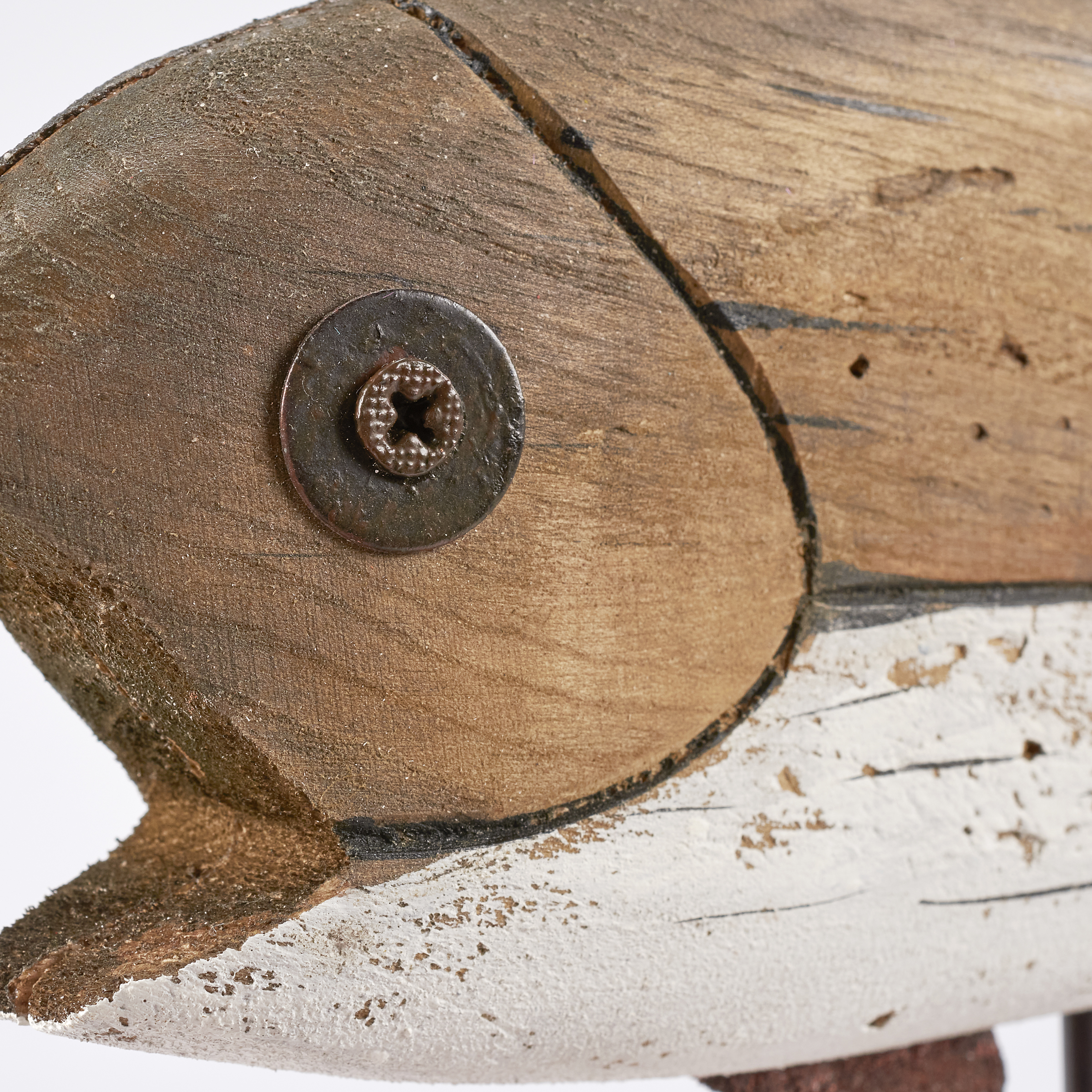 A decorative bass fish from our Beach Collection displaying a driftwood inspired design made of natural wood with painted accents and distressed details. Decorative open mouth bass features aged metal fins and sits on a metal stake attached to a wood base for a floating appearance. Our Open Mouth Bass sitter is designed to free-stand on any flat surface making it easy to display. A rustic beach-themed home accent that coordinates well with primitive home décor.