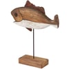 A decorative bass fish from our Beach Collection displaying a driftwood inspired design made of natural wood with painted accents and distressed details. Decorative open mouth bass features aged metal fins and sits on a metal stake attached to a wood base for a floating appearance. Our Open Mouth Bass sitter is designed to free-stand on any flat surface making it easy to display. A rustic beach-themed home accent that coordinates well with primitive home décor.