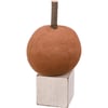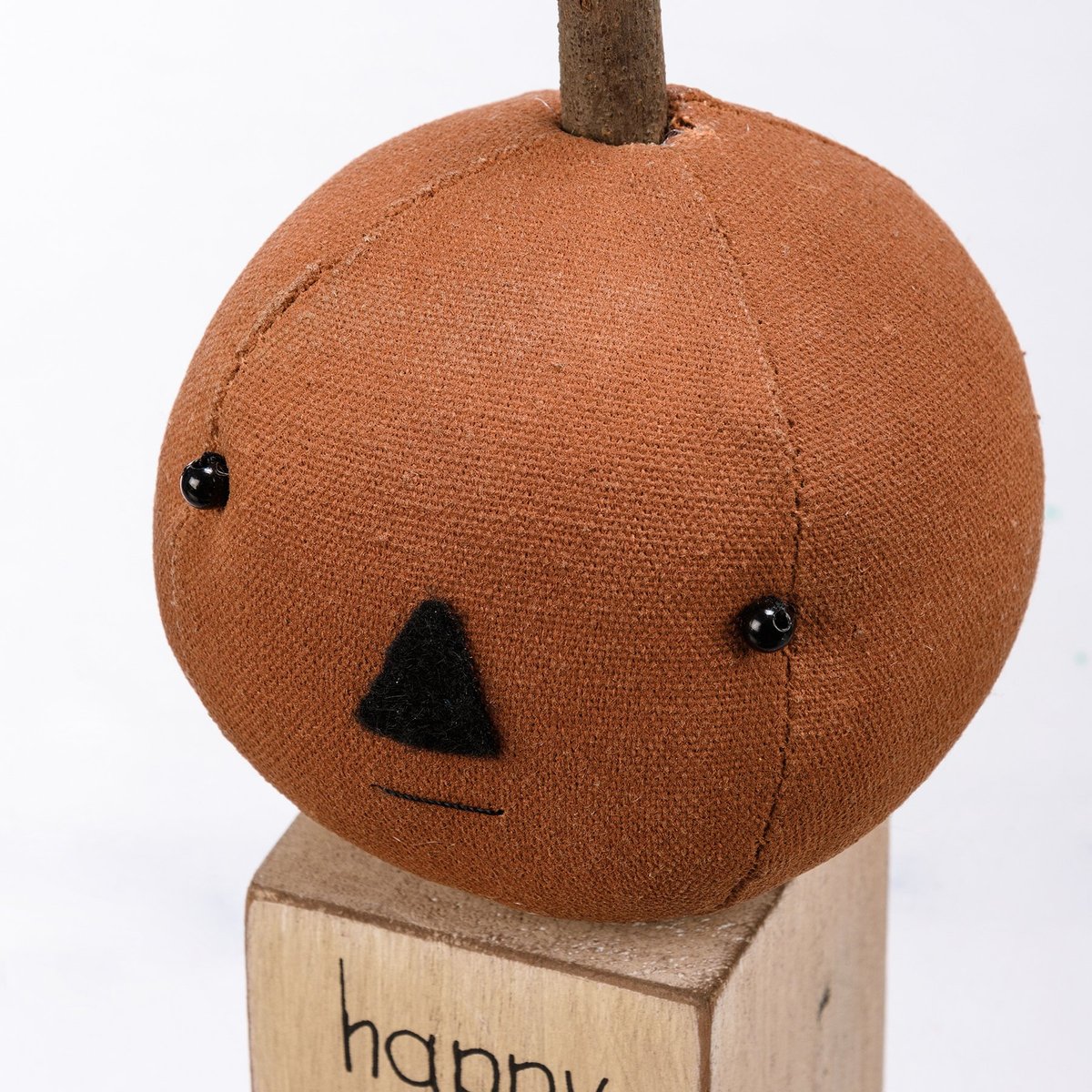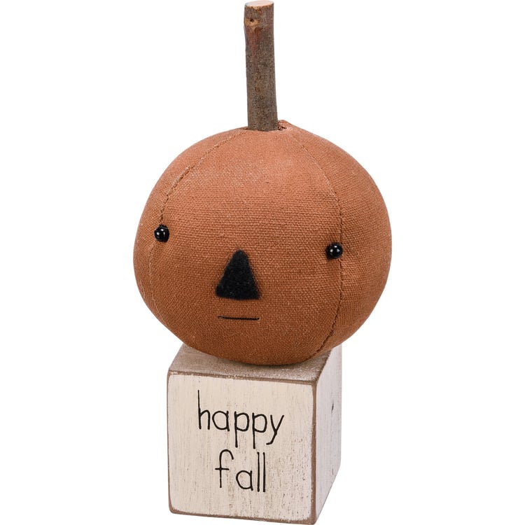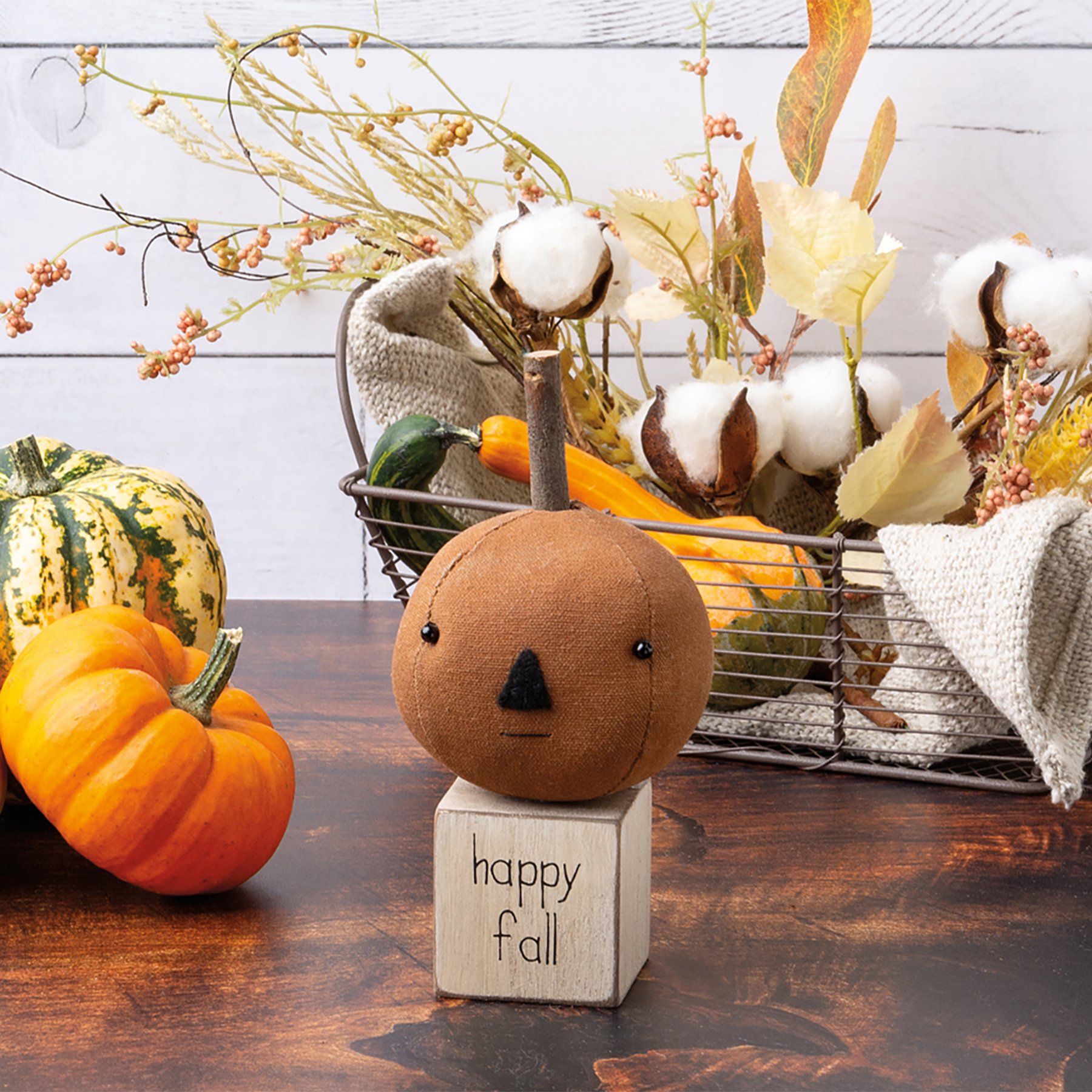 A wooden chunky sitter with a fabric pumpkin head on top. Wooden base of sitter features "Happy Fall" sentiment. Our Pumpkin Head sitter is designed to stand alone on any flat surface.