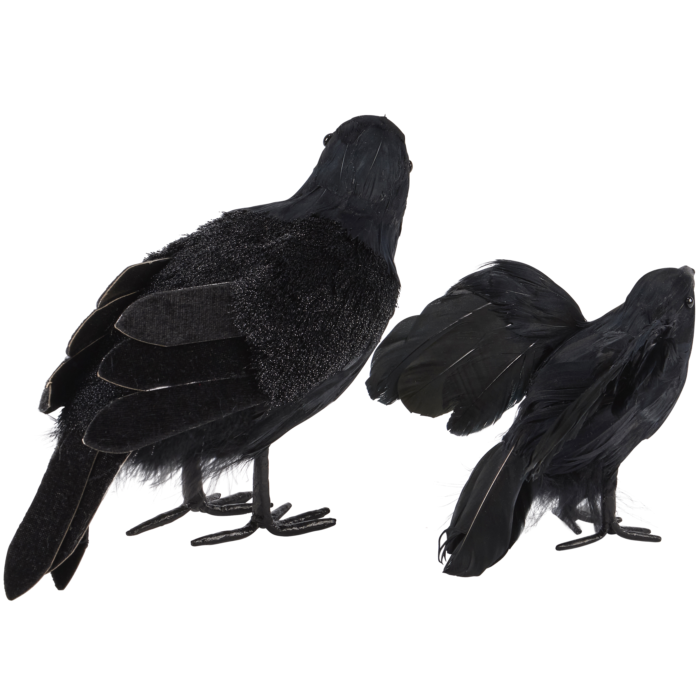 A set of decorative sitters from our Halloween Collection featuring 2 standing black crows with individual poses in a handmade craft style. Crow sitters feature textured accents such as fabric and feather details. Our Black Crow sitters are designed to free-stand on flat surface for display using attached wire feet. A fun seasonal home accent to display alone or in seasonal home décor display.