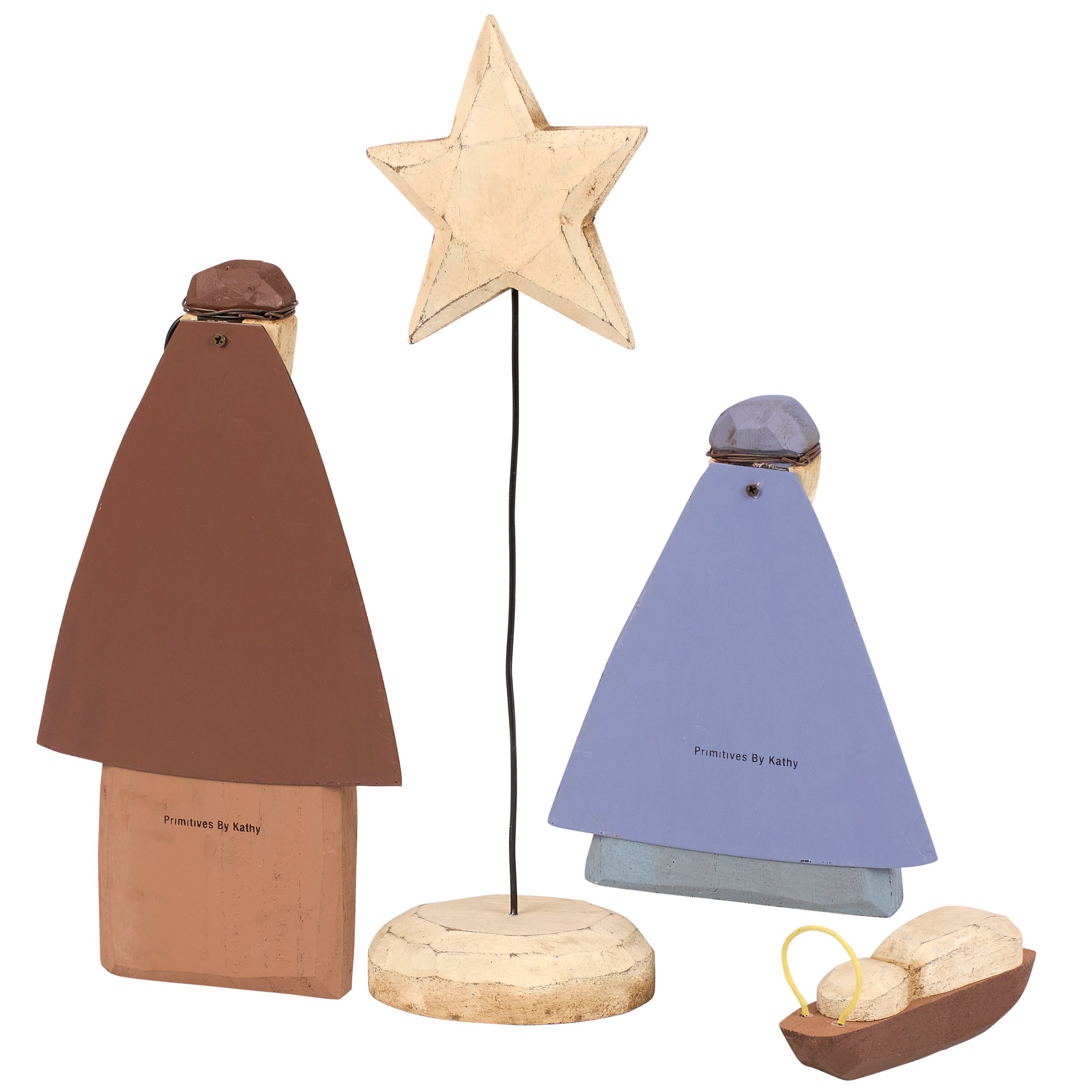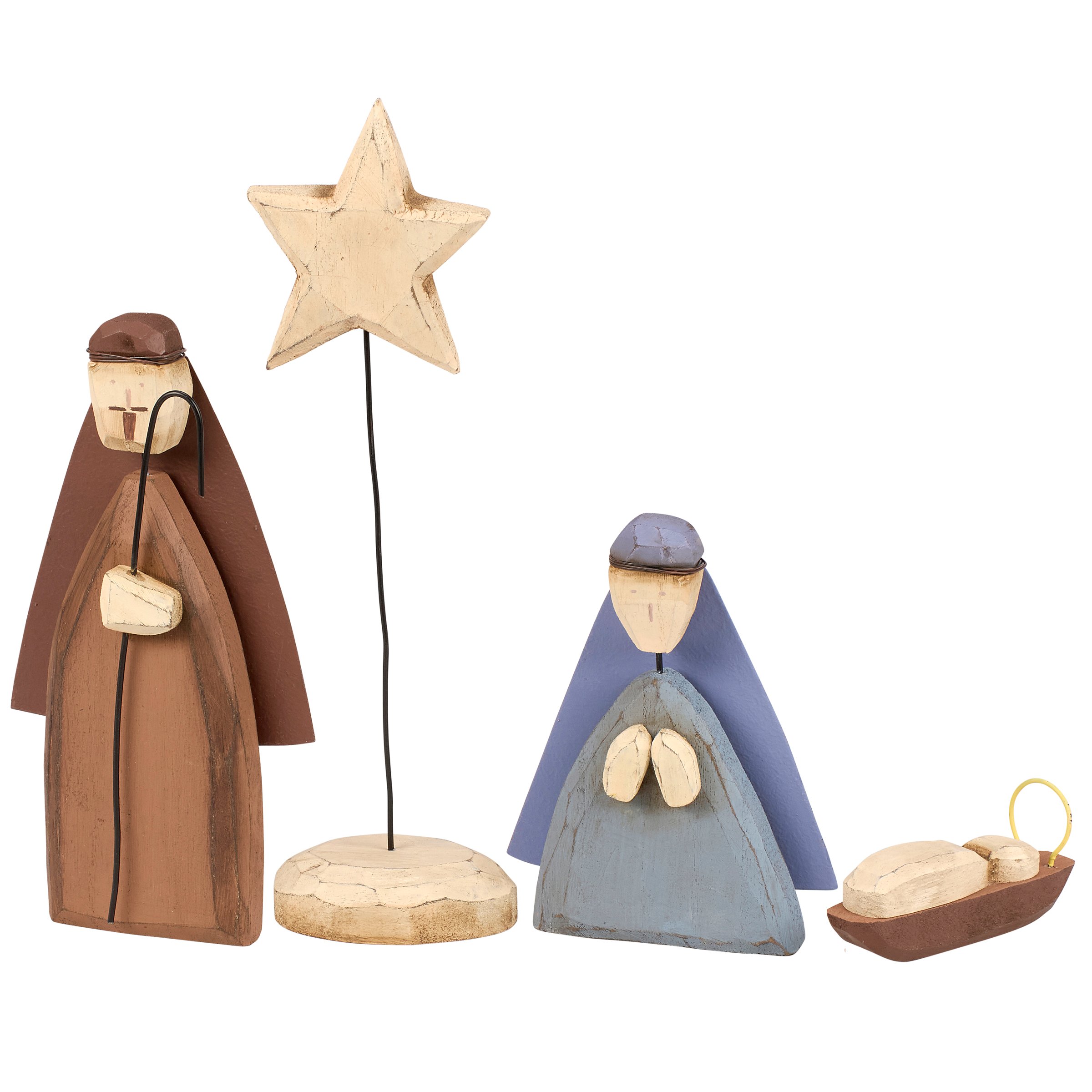A decorative sitter set from our Christmas Collection displaying a rustic nativity scene recreated from original hand carved pieces with distressed details and metal accents. Nativity sitters feature shaped metal wire and painted details to create a handmade feel. Our Holy Family sitter set is designed to free-stand on flat surface for easy display. A rustic nativity home accent perfect for seasonal display.