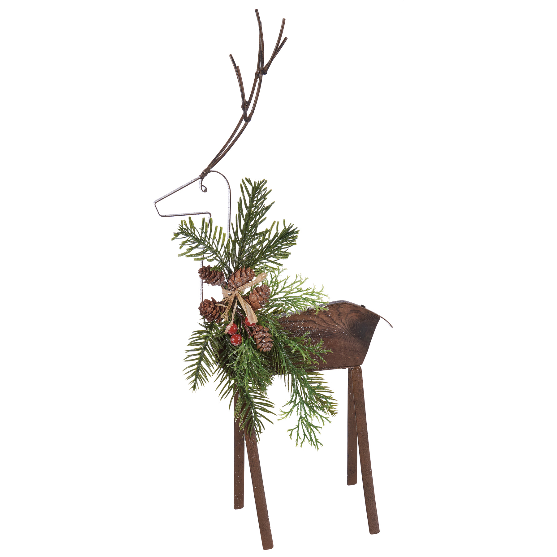 A large set of metal and wood sitters from our Christmas Collection displaying deer with woodland botanical elements and unique poses. Our Christmas Deer figurines feature two sitters with wood body and metal head and legs in minimalist line art style. Each sitter includes a botanical bundle of pine and red berries with glitter accents. The large Christmas deer sitter set free-stands alone on flat surface.
