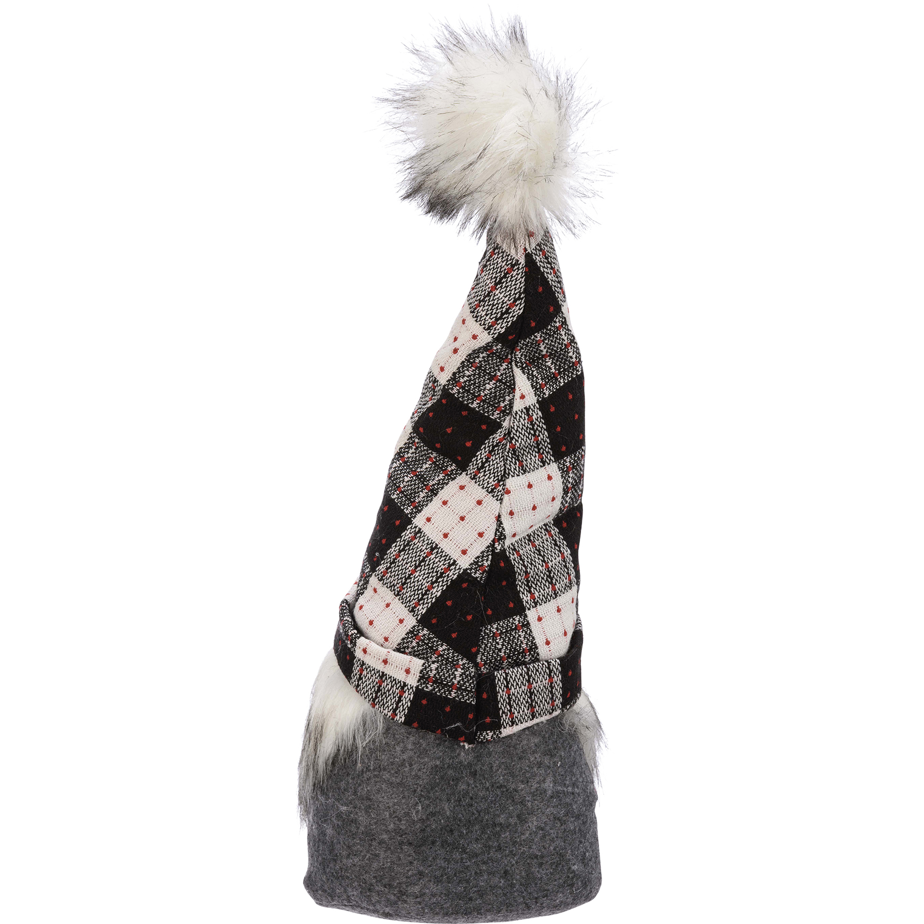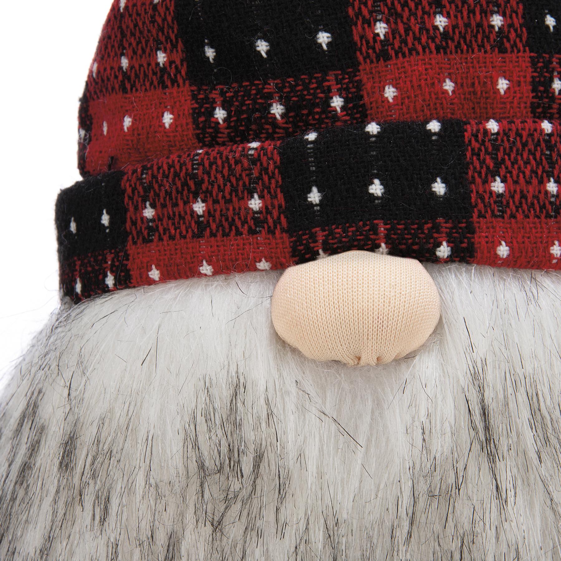 A set of two large weighted gnome sitters with fabric hats featuring a black and red plaid color palette. Gnome includes fluffy beard and pom pom details and fabric nose for added interest. Set pairs well with other holiday plaid items for a cohesive Christmas display.