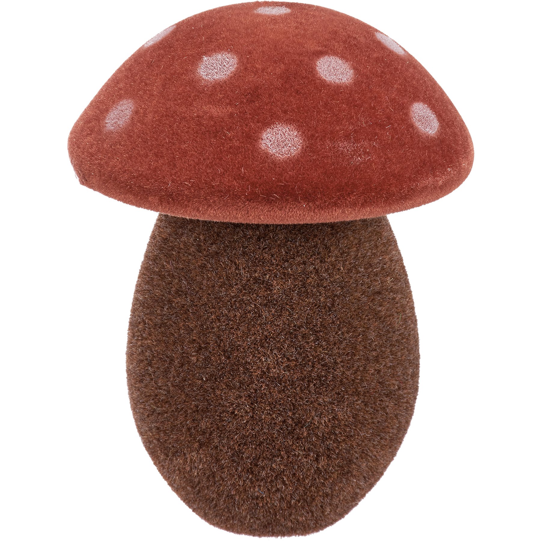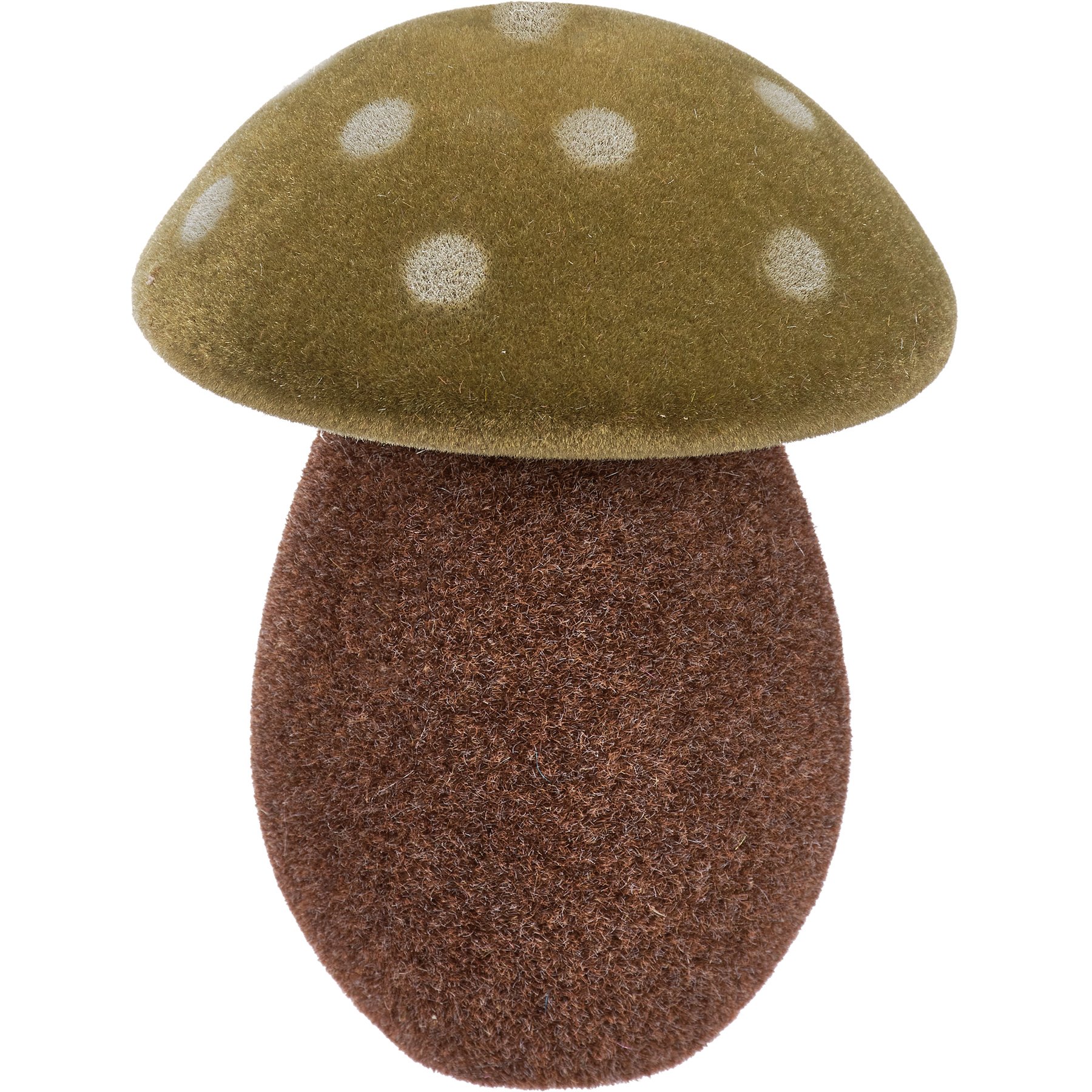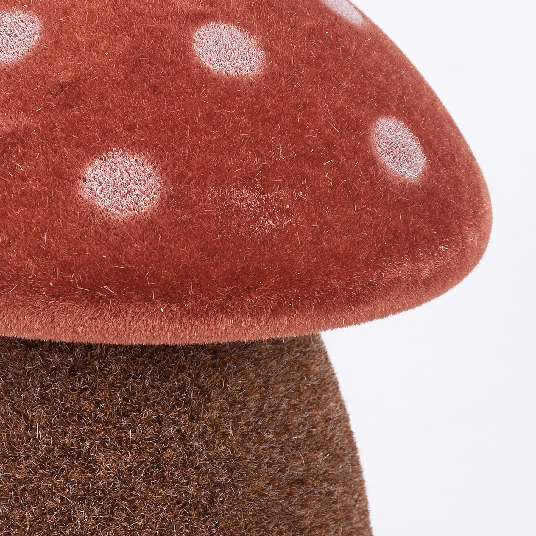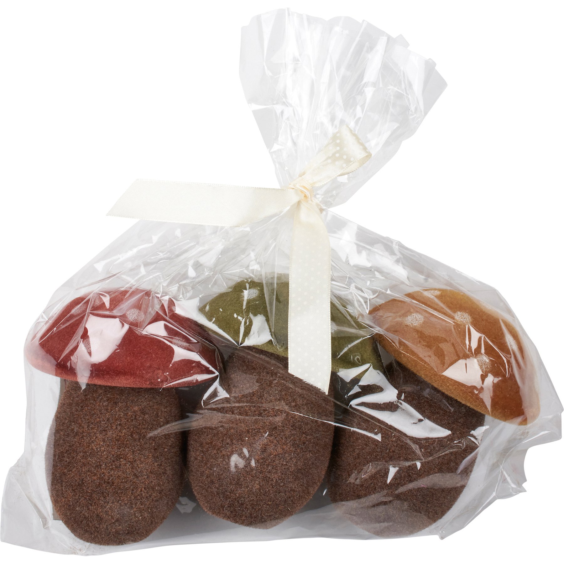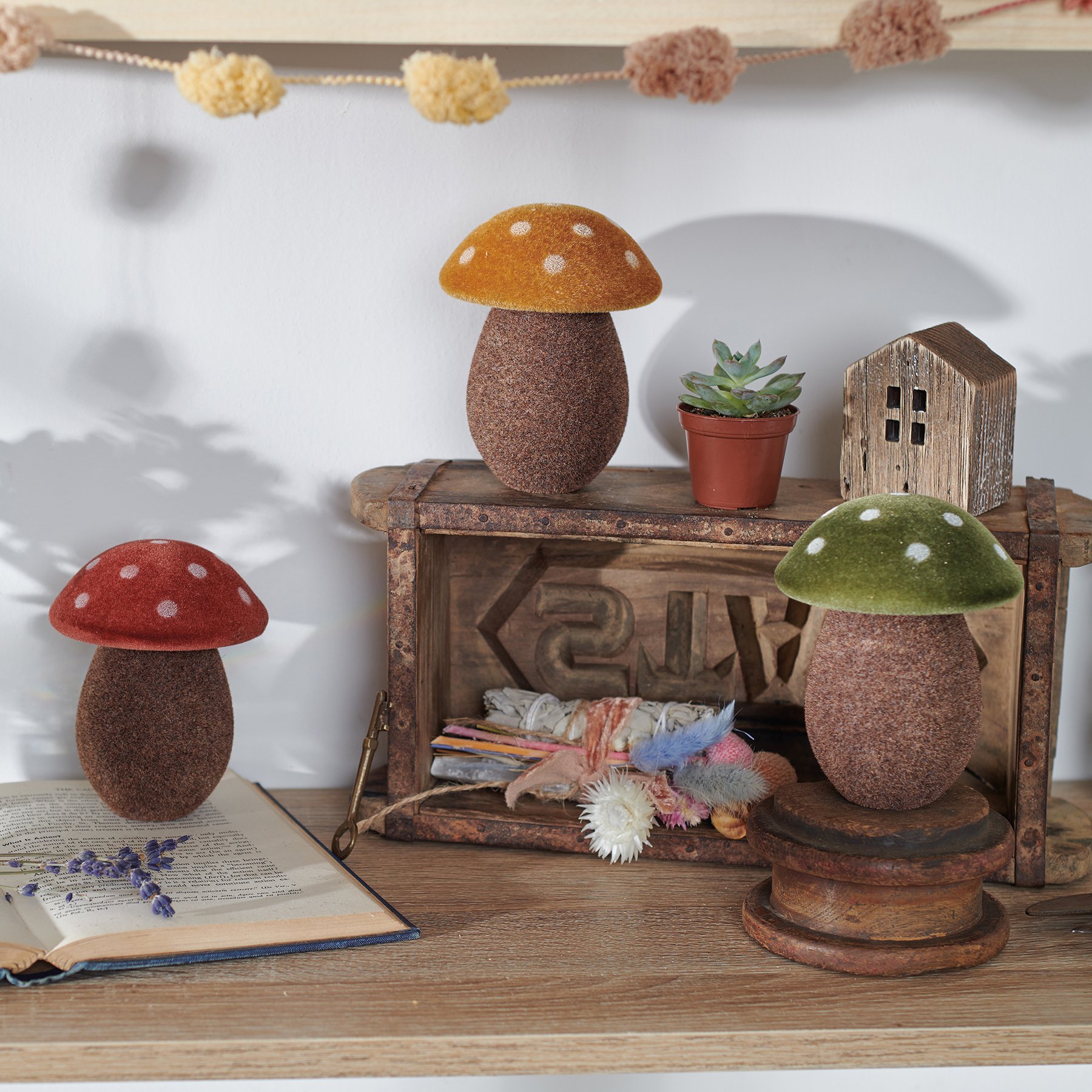 An ornament set from our Cottagecore Collection displaying vintage style mushrooms with unique colored tops. Set features three mushrooms with a flocked finish for added texture. Our Mushrooms ornament set includes a red, green, and orange mushroom. Each ornament can free-stand on flat surface.