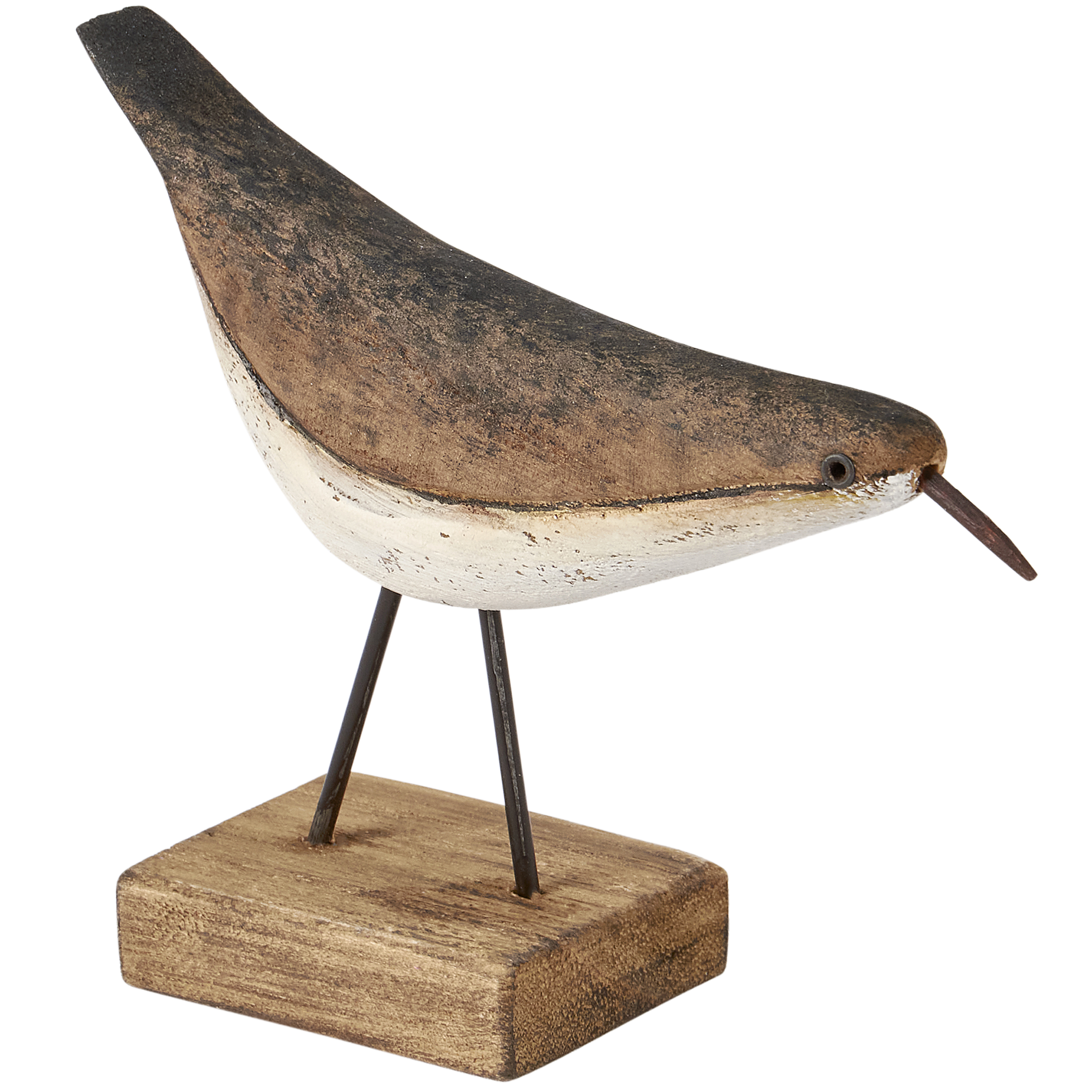 A decorative shorebird from our Beach Collection displaying a driftwood inspired design made of natural wood with painted accents and distressed details. Decorative shorebird features an aged metal beak and sits on metal stakes resembling bird legs attached to a wood base. Our Shorebird sitter is designed to free-stand on any flat surface making it easy to display. A rustic beach-themed home accent that coordinates well with primitive home décor.
