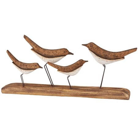 Decorative shorebirds from our Beach Collection displaying a driftwood inspired design made of natural wood with painted accents and distressed details. Decorative shorebirds feature aged metal accents and sit on metal stakes resembling bird legs attached to a wood base. Our Shorebird Flock sitter is designed to free-stand on any flat surface making it easy to display. A rustic beach-themed home accent that coordinates well with primitive home décor.