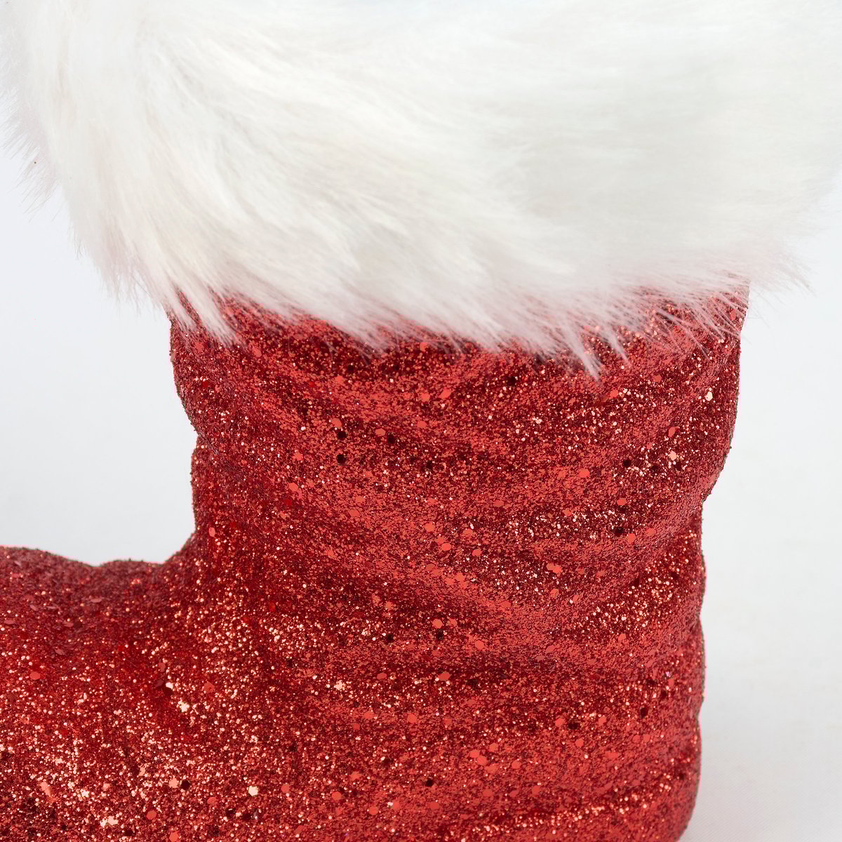 A small decorative sitter from our Christmas Collection displaying a sculpted Santa boot design with red glitter finish and white fur trim for added interest. Our small Glitter Santa Boot is designed to free-stand on a flat surface for easy display. A fun retro Christmas home accent that can be easily displayed in any home or work space.