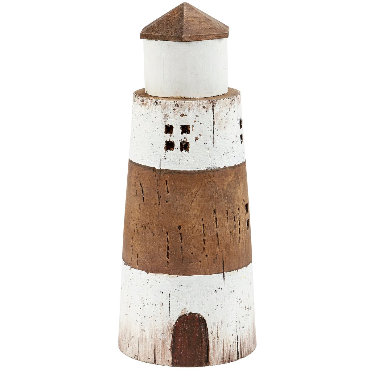 A small decorative lighthouse from our Beach Collection displaying a driftwood inspired design made of natural wood with painted accents and distressed details. Decorative lighthouse features aged metal for the door and window cutouts. Our small Lighthouse sitter is designed to free-stand on any flat surface making it easy to display. A rustic beach-themed home accent that coordinates well with primitive home décor.