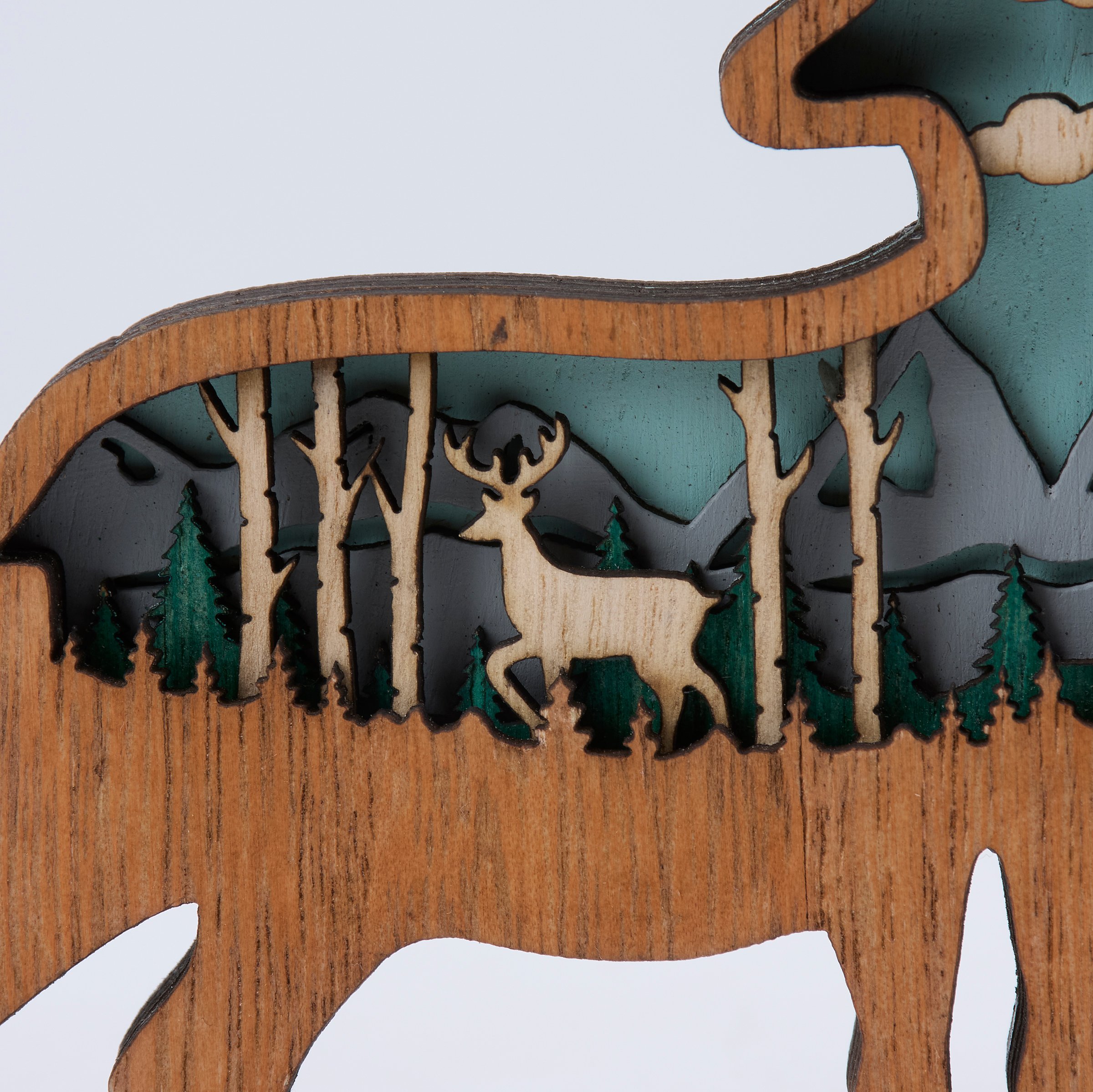 A wooden sitter from our Lake & Cabin Collection featuring a stag shape cut from natural wood with a forest scene of stag displayed inside that is made with layered cutouts of colored wood pieces for added dimension. Our Stag sitter is designed to free stand on flat surface for display. A nature themed home accent that can be easily displayed in any home or work space.