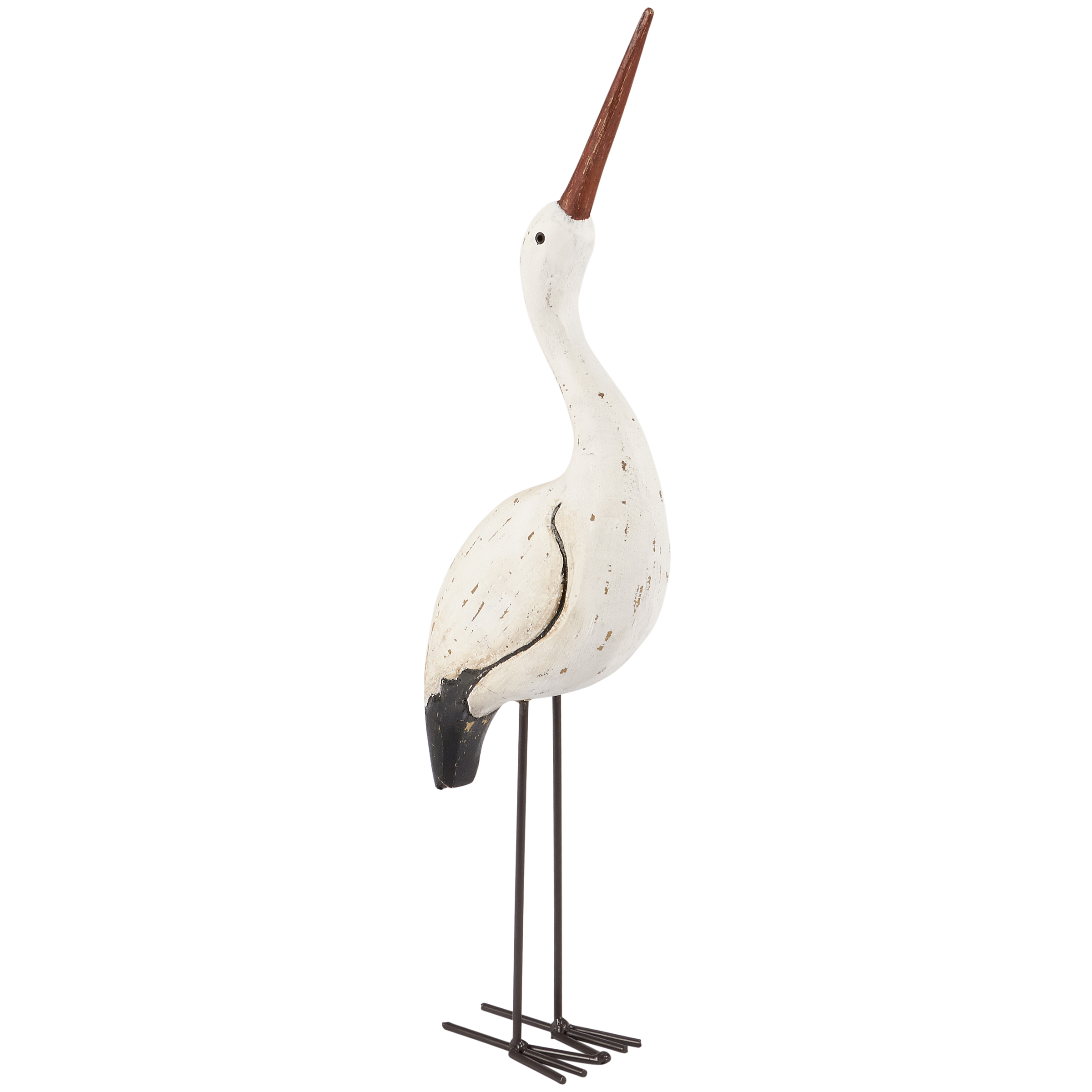 A decorative stork from our Beach Collection displaying a driftwood inspired design made of natural wood with painted accents and distressed details. Decorative stork features aged metal accents and sits on metal stakes resembling bird legs. Our Stork sitter is designed to free-stand on any flat surface making it easy to display. A rustic beach-themed home accent that coordinates well with primitive home décor.