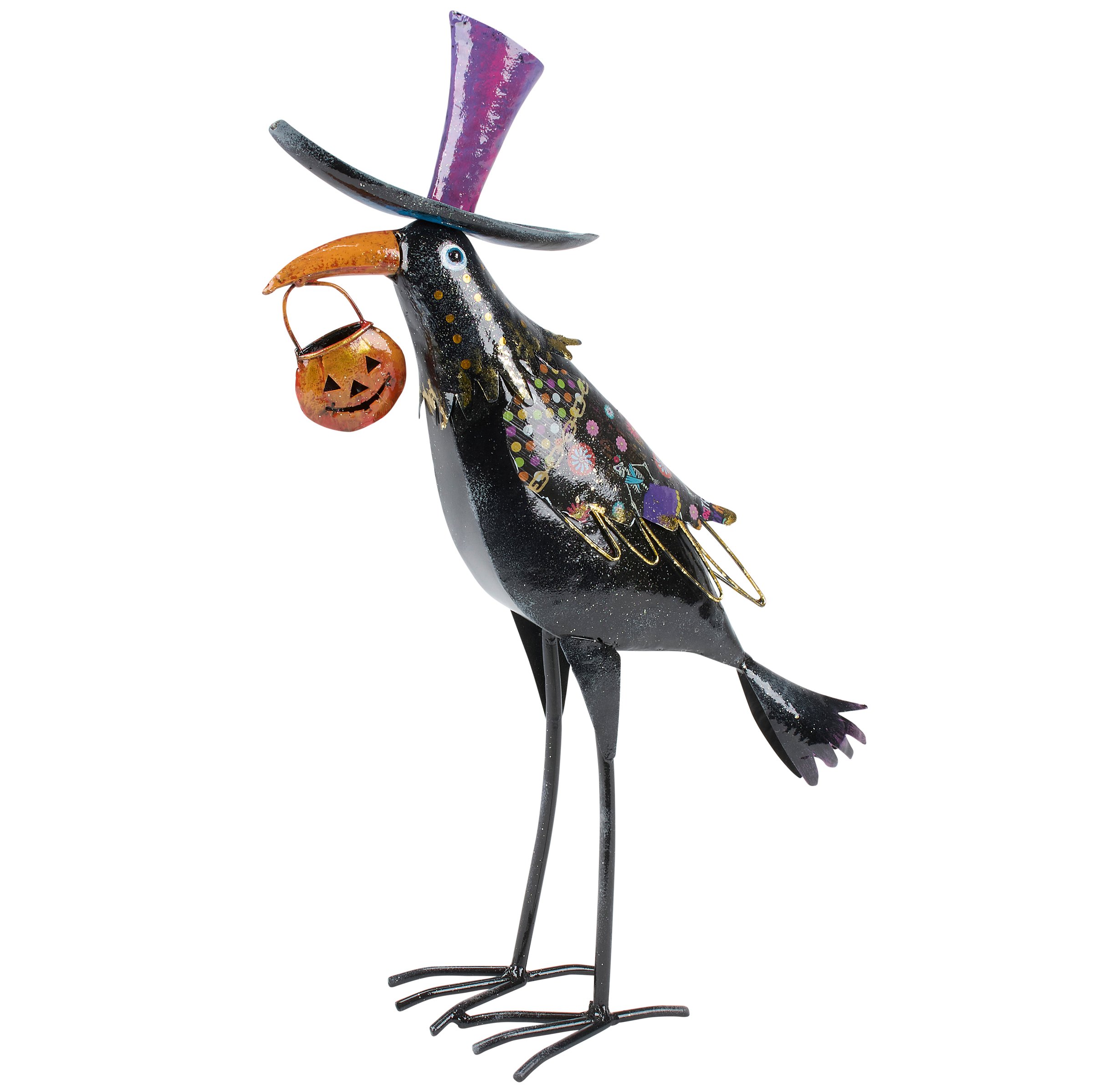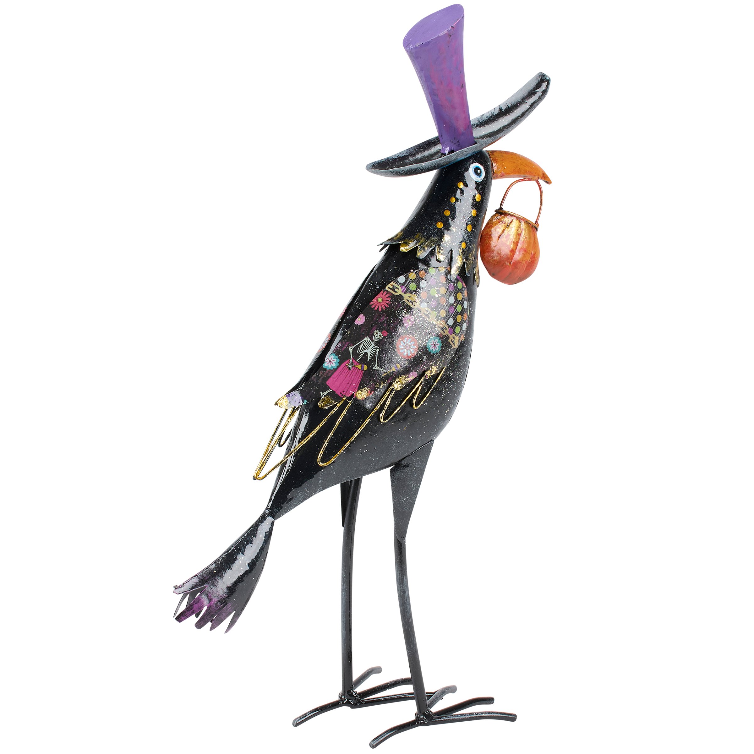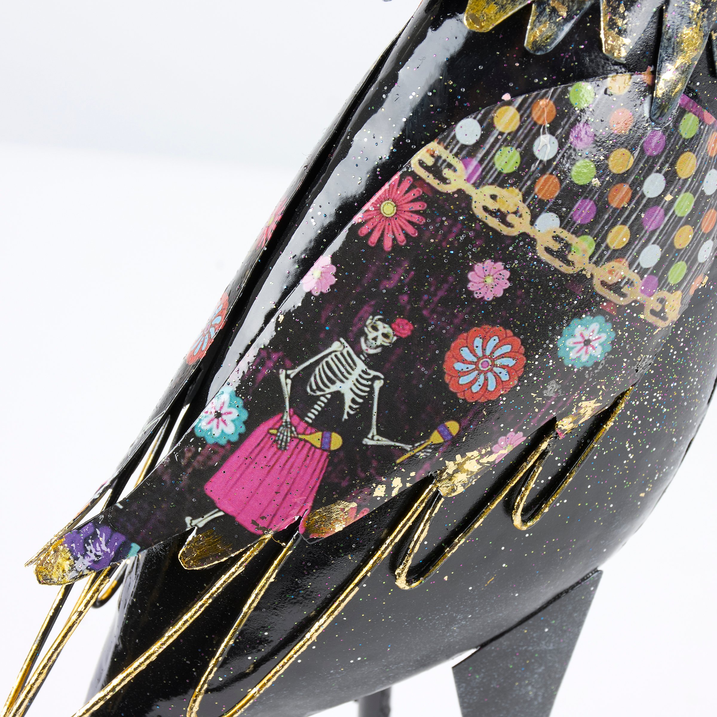 A metal art piece from our Halloween Collection displaying a whimsical raven character design made with colorful painted metal pieces for a handmade aesthetic. Halloween raven features colorful painted designs on its body and a trick-or-treat bucket hanging from its mouth as well as glitter and metallic gold accents throughout. Our Trick-Or-Treat Raven sitter is designed to free stand on flat surface for display. A whimsical Halloween home accent that easily adds seasonal style to any home or work space.