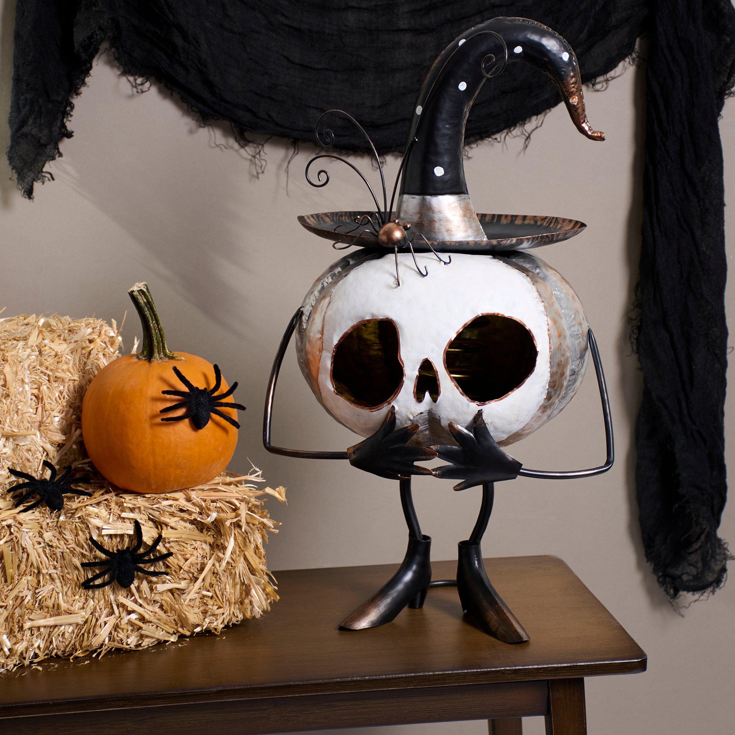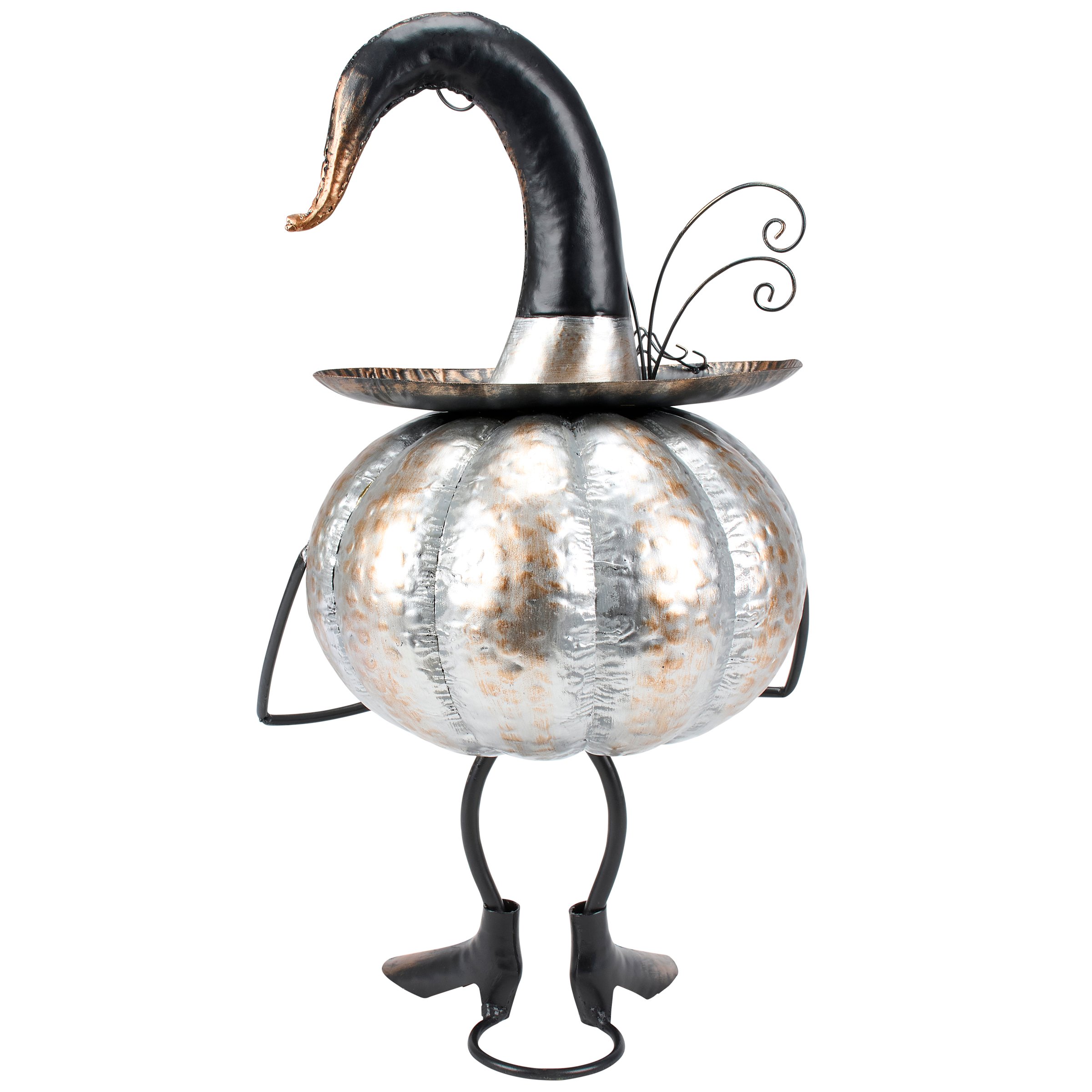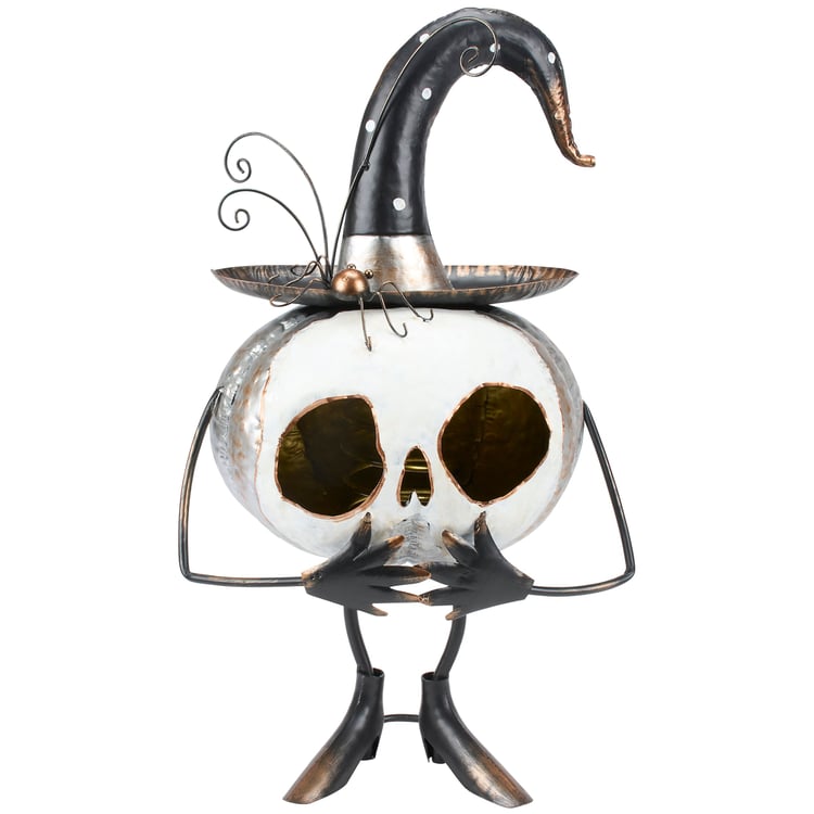 A metal art piece from our Halloween Collection displaying a whimsical ghost witch design made with painted metal pieces for a handmade aesthetic. Halloween ghost features metallic finish accents throughout as well as a sturdy spring inside that adds fun motion to the sitter. Our Witchy Ghost sitter is designed to free stand on flat surface for display. A whimsical Halloween home accent that easily adds seasonal style to any home or work space.