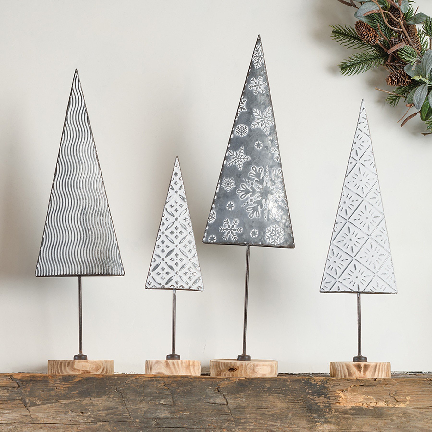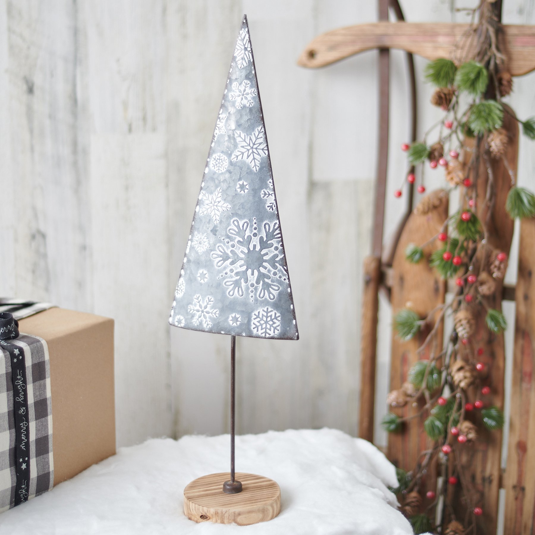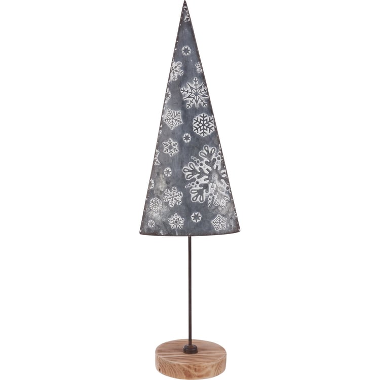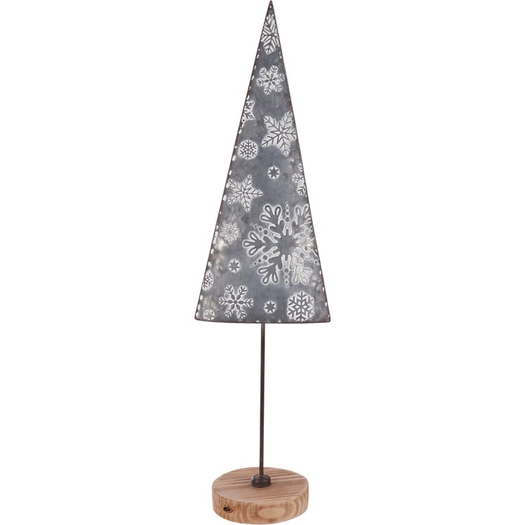 A large metal and wood sitter from our Christmas Collection displaying a textured Christmas tree. The snowflake tree sitter features wood base and embossed dark metal with a brush of white to accent snowflake pattern. Free-stands alone on flat surface.