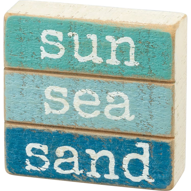 A slat wood box sign in a beach-inspired color blocked palette featuring a typeset "Sun - Sea - Sand" sentiment. Easy to hang or can free-stand alone.
