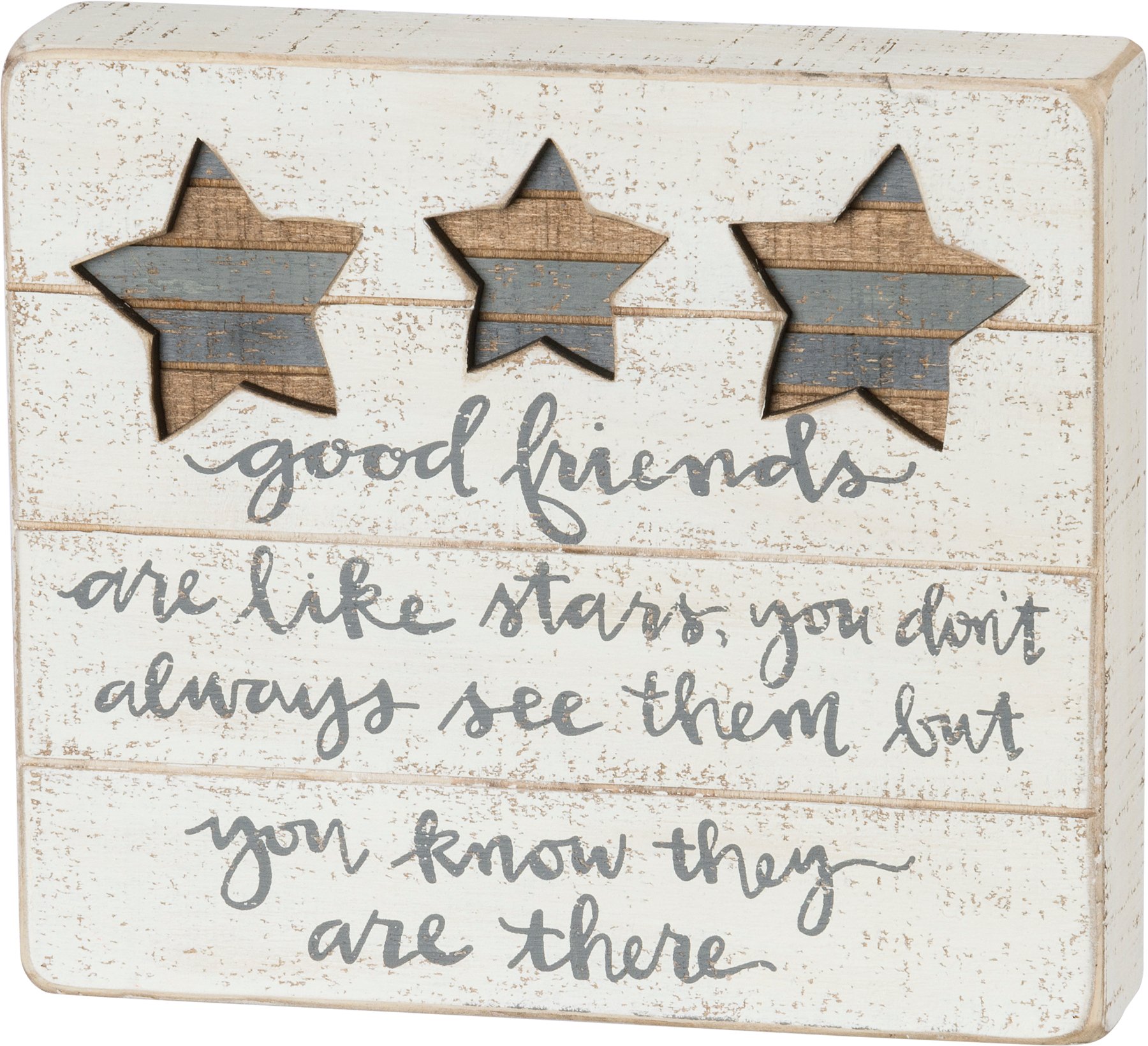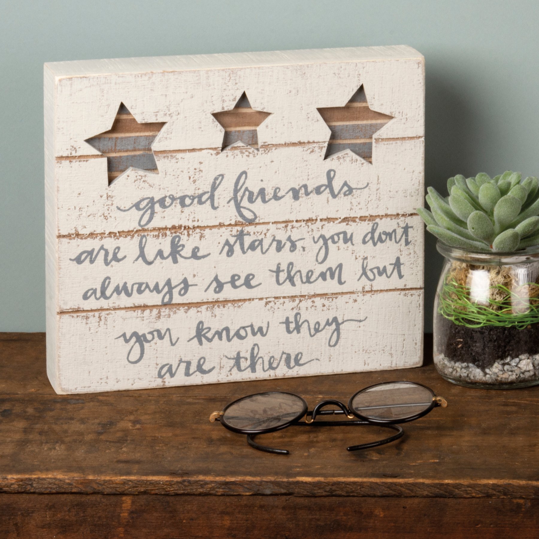 A slat wood box sign lending a "Good Friends Are Like Stars, You Don't Always See Them But You Know They Are There" hand lettered sentiment with cut-out star designs with striped coloration accents. Easy to hang or can free-stand alone. Complements well with coordinating design pieces for a great gift set or rustic decor collection.