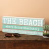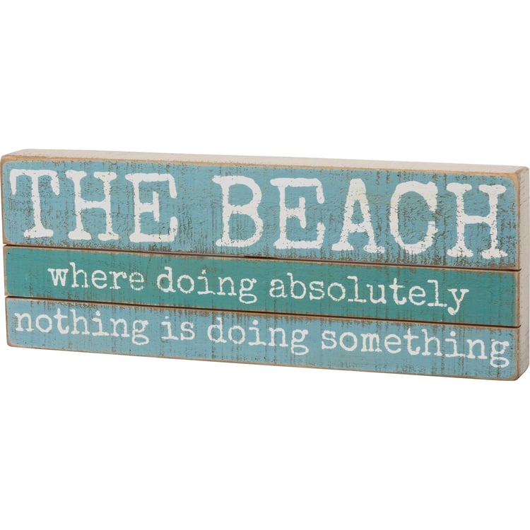 A slat wood box sign lending a distressed "The Beach Is My Happy Place" hand lettered sentiment in a beach-inspired color blocked palette. Easy to hang or can free-stand alone.