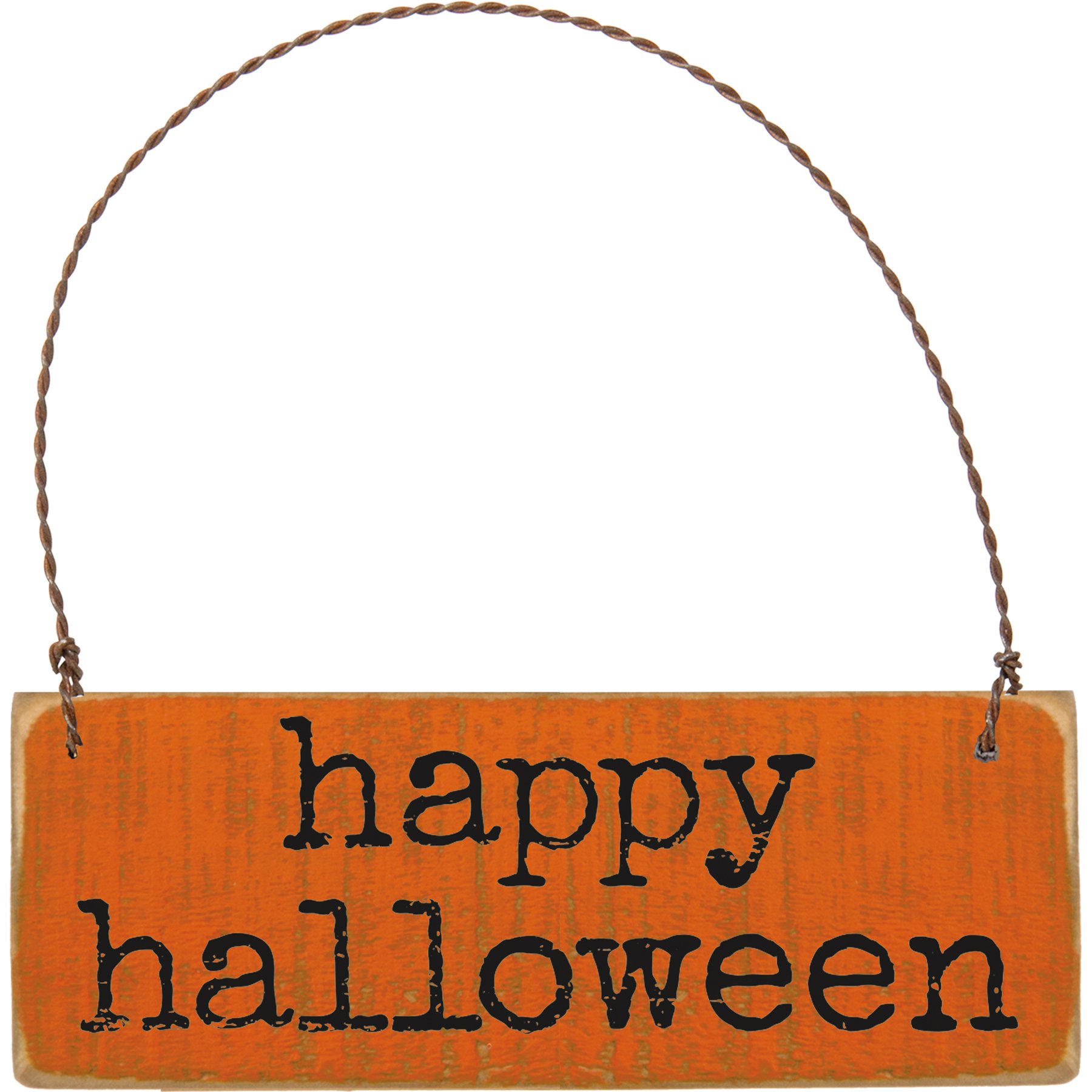 A slat wood ornament lending a distressed "Happy Halloween" sentiment with twisted top wire loop for easy hanging. Complements well with existing decor or coordinating design pieces for a festive collection.