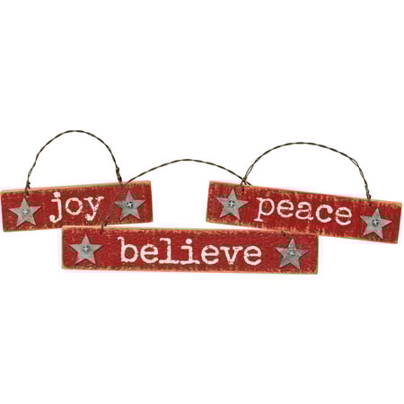 A set of three wooden ornaments featuring distressed "Joy," "Peace," and "Believe" sentiments with metal star additions. Contain twisted top wire loops for easy hanging. Complement well with coordinating design pieces or existing decor.