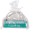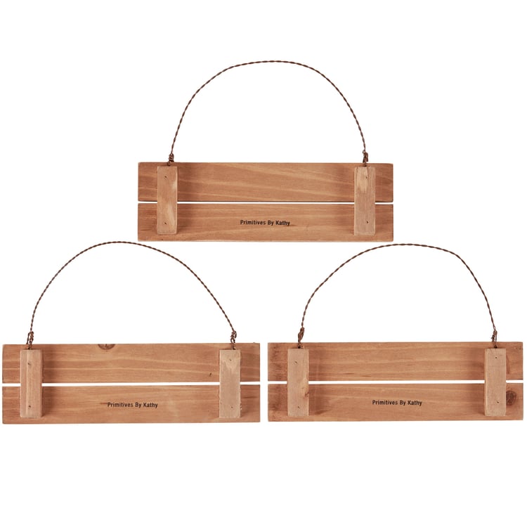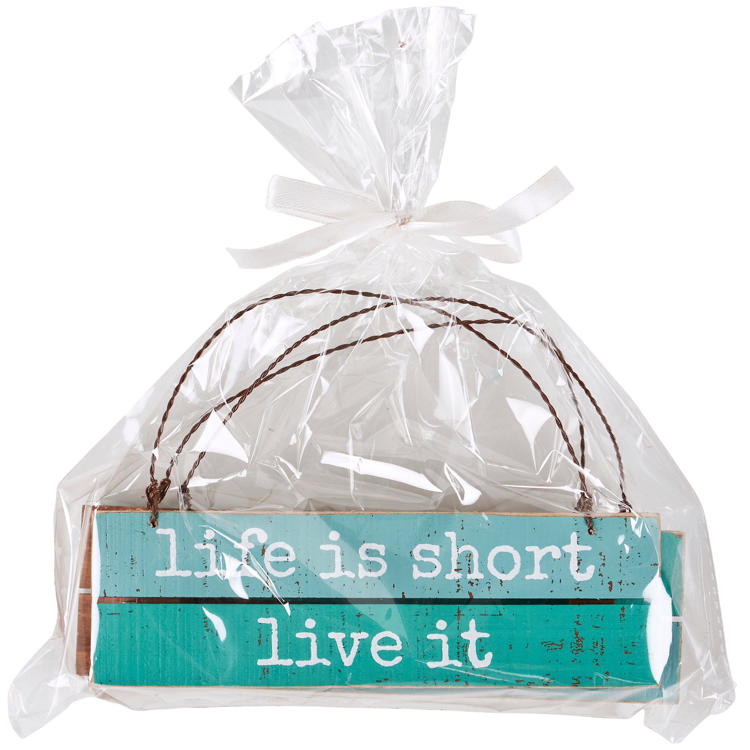 A set of three decorative ornaments from our Beach Collection displaying a rustic inspired slat wood design with ocean color palette and inspirational beach-themed sentiments on each. Sentiments read "Life Is Short - Live It," "Good Times - Tan Lines," and "Don't Worry - Beach Happy." Ornaments feature distressed details and attached twisted wire hangers for easy display. Our Tan Lines Slat Ornament Set comes packaged in a poly bag tied with ribbon. A set of beach-themed home accents with a variety of display options.
