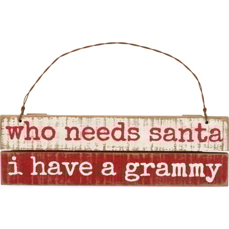 Rustic style meet simple Christmas charm with this slat wood ornament, featuring a distressed "Who Needs Santa - I Have A Grammy" sentiment in an understated color blocked palette. Complements well with existing decor or coordinating styles for a cohesive collection. Contains twisted top wire loop for easy hanging.