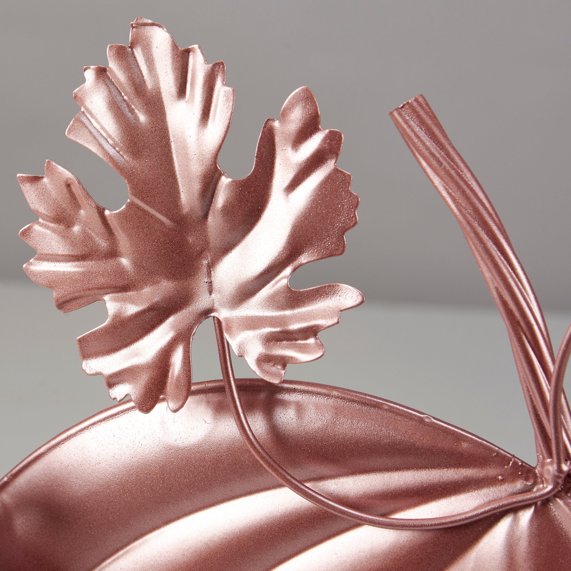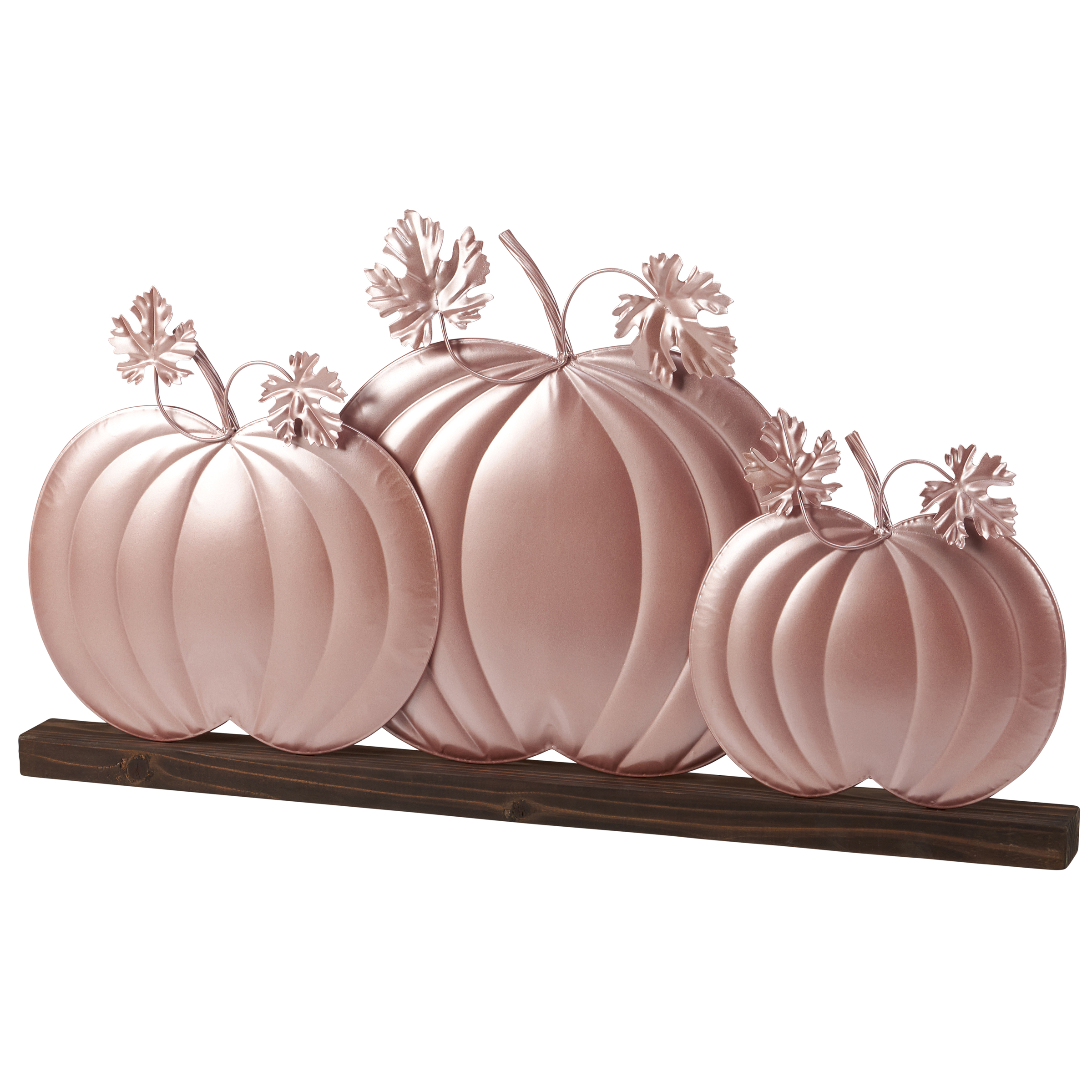 A decorative sitter from our Fall & Harvest Collection featuring metal pumpkins displaying a metallic blush color attached to a coordinating dark natural wood base. Our Blush Pumpkins slat sitter is designed to free-stand on any flat surface for display. A stylish fall home accent that can be easily displayed in any home or work space.