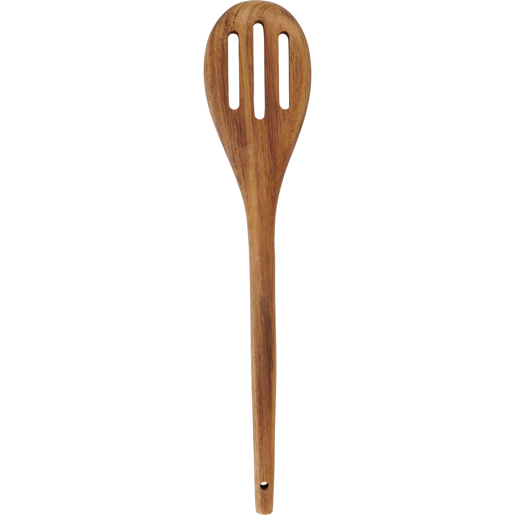 A wooden slotted spoon displaying a simple farmhouse design. Coordinates well with kitchen décor from our Cottagecore Collection. Our Simple Farm slotted spoon includes hole for hanging in kitchen. Hand wash recommended. A neutral everyday kitchen accessory that blends with a variety of styles.