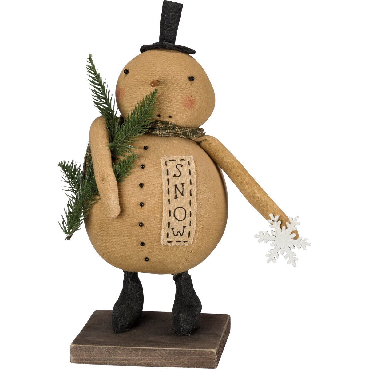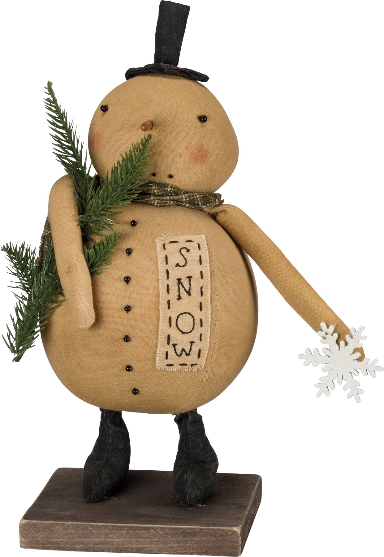 A primitive standing snowman with stitched panel lending a "Snow" sentiment. Greenery, snowflake, hat, and scarf details. Stitched and beaded features on face and body. Great to display with others in collection for a cohesive Winter display!
