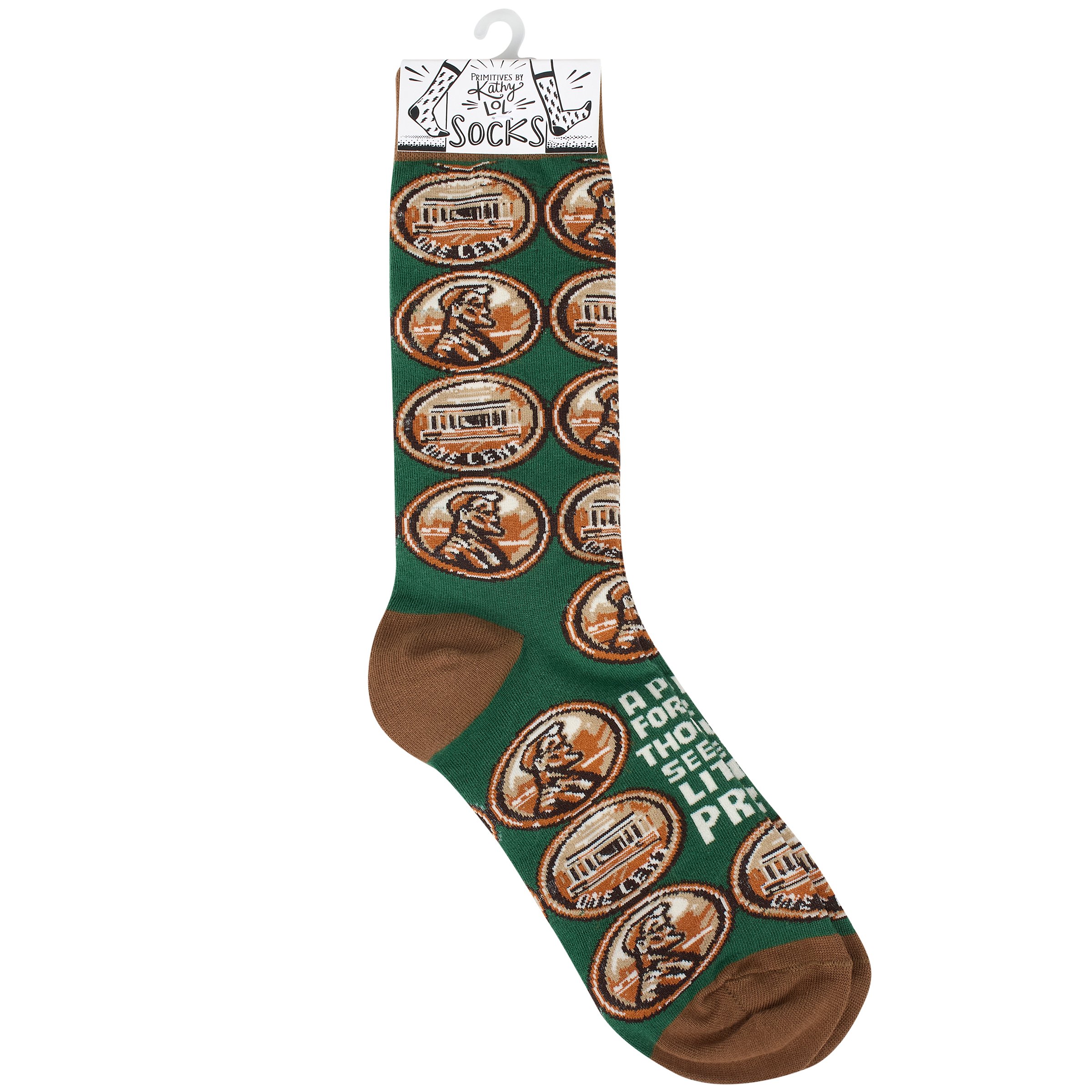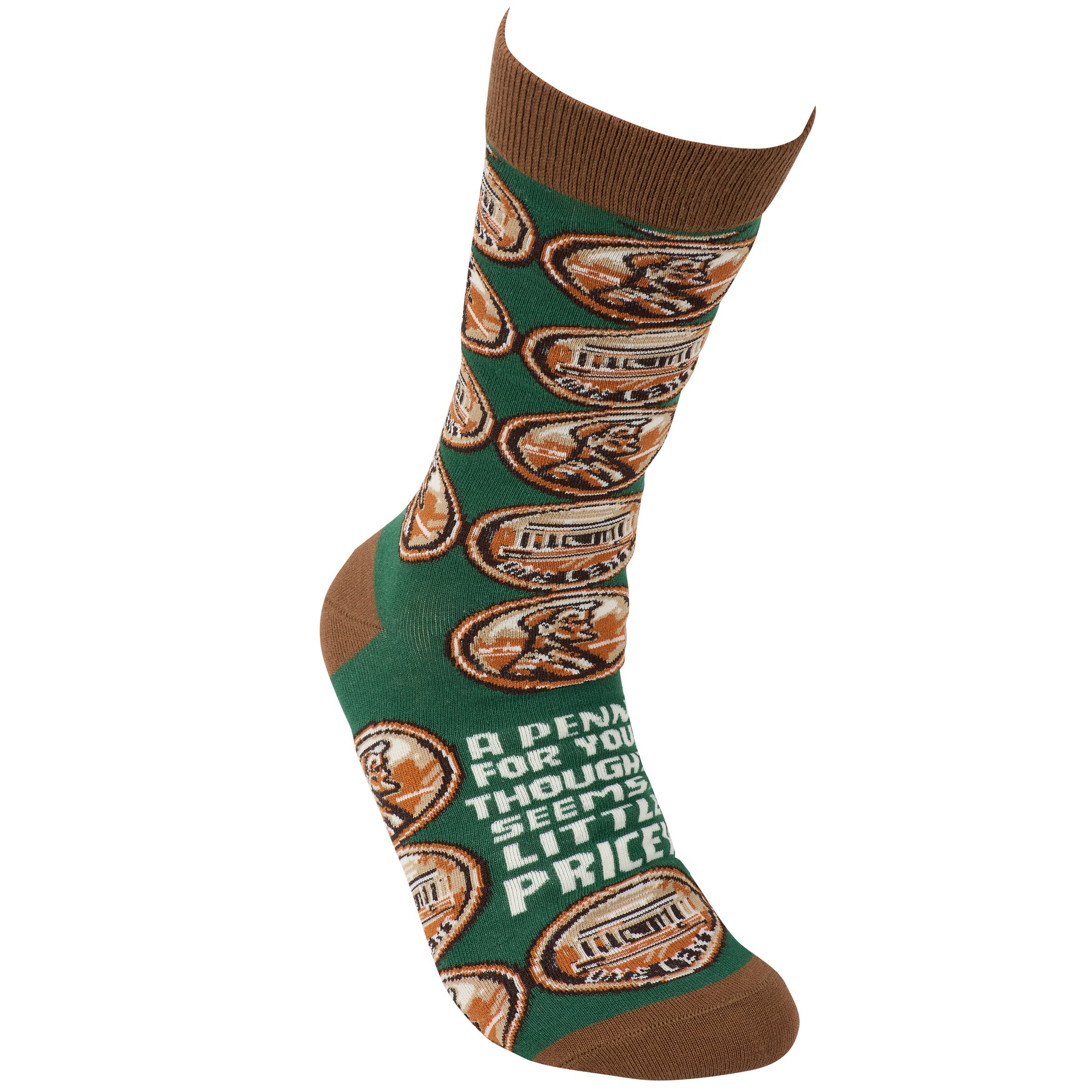 A pair of colorful socks from our LOL-Made You Smile Collection displaying playful hand illustrated designs of pennies with a sarcastic sentiment that reads "A Penny For Your Thoughts Seems A Little Pricey." These giftable socks are made with a cotton, nylon, and spandex blend for a one size fits most design. Our Penny For Your Thoughts Seems Pricey socks come with a decorative header card and a clear plastic hanger for easy rack display and gifting. A fun gift perfect for everyday self-expression.