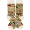 A pair of colorful socks from our Homestead Collection displaying unique hand illustrated designs of a farming hoe and vegetables with a humorous farm-themed sentiment that reads "Hoeing Ain't Easy." Socks feature a one size fits most design made with cotton, nylon, and spandex. Our Ain't Easy socks come with a header card and a clear plastic hanger for display. A fun farm-themed gift perfect for everyday self-expression.