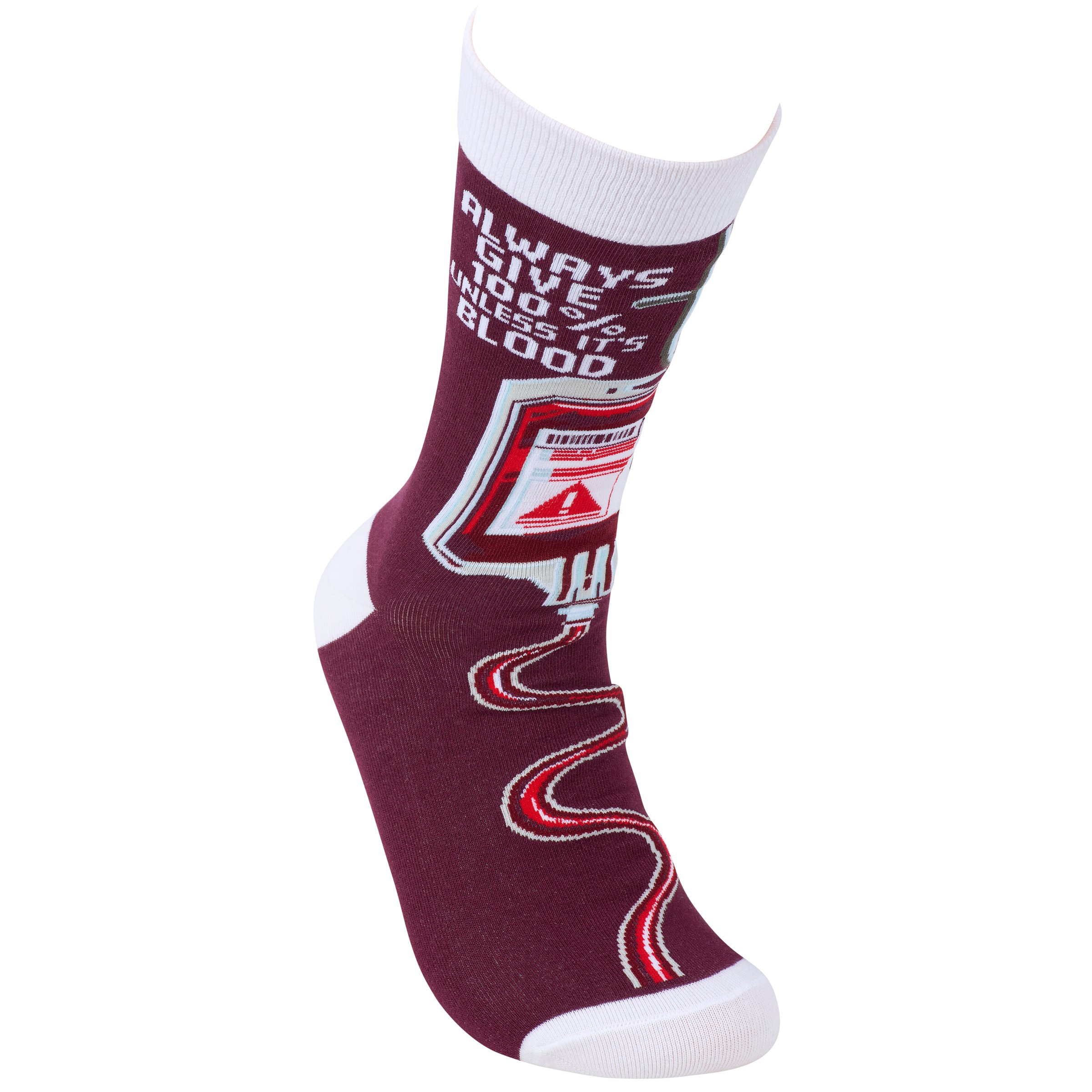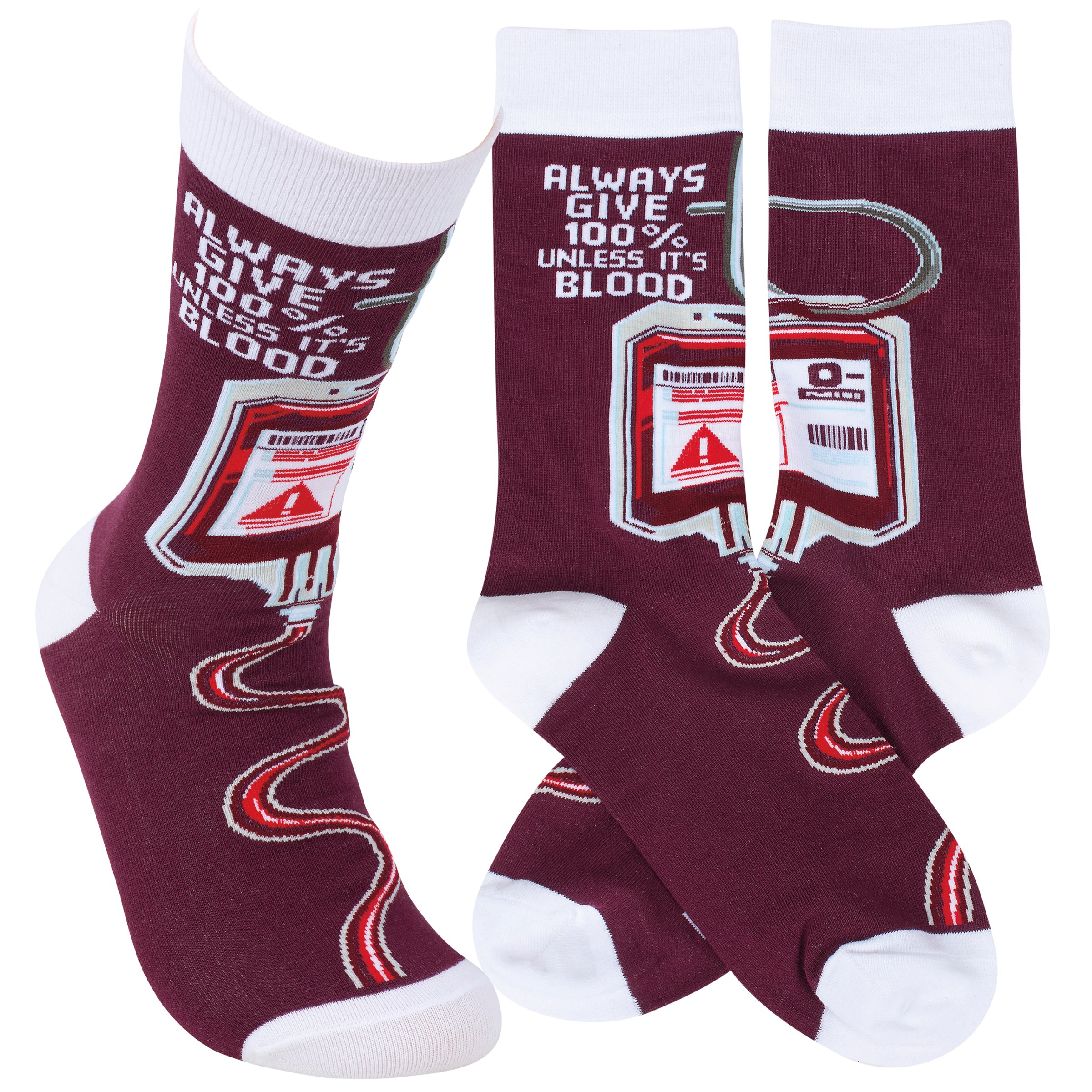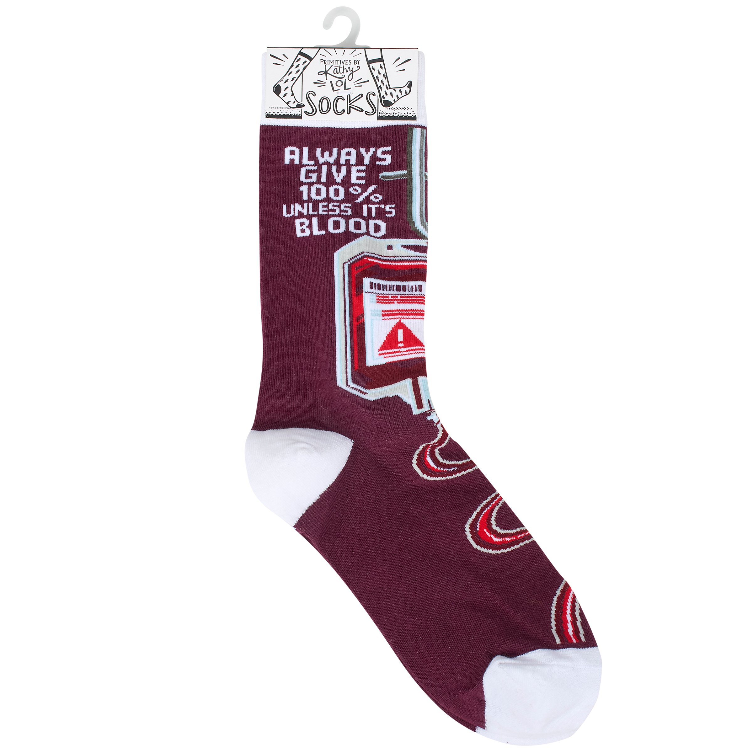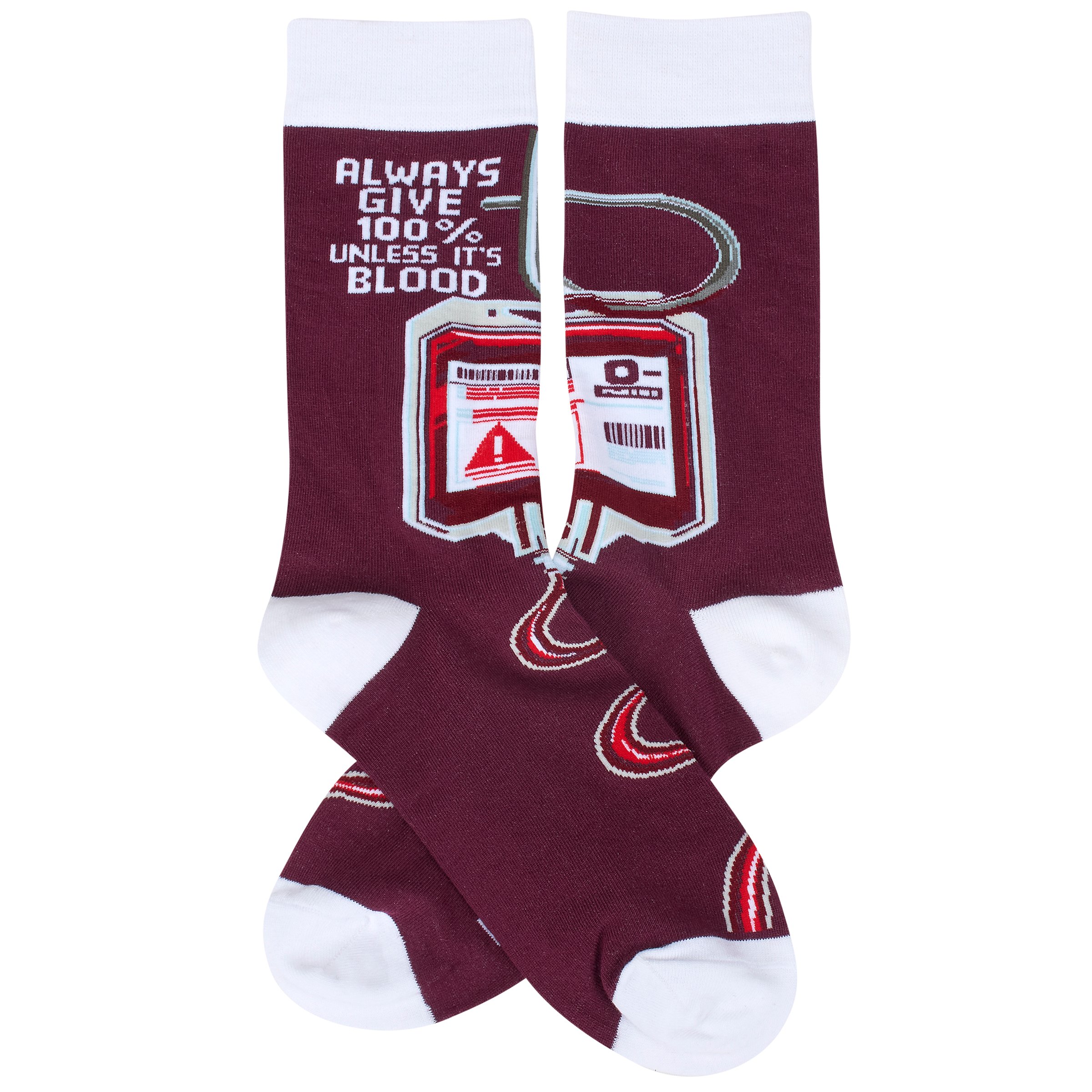 A pair of colorful socks from our LOL-Made You Smile Collection displaying a playful hand illustrated design of a blood bag with a funny sentiment that reads "Always Give 100% Unless It's Blood." These giftable socks are made with a cotton, nylon, and spandex blend for a one size fits most design. Our Give 100% Unless It's Blood socks come with a decorative header card and a clear plastic hanger for easy rack display and gifting. A fun gift perfect for everyday self-expression.