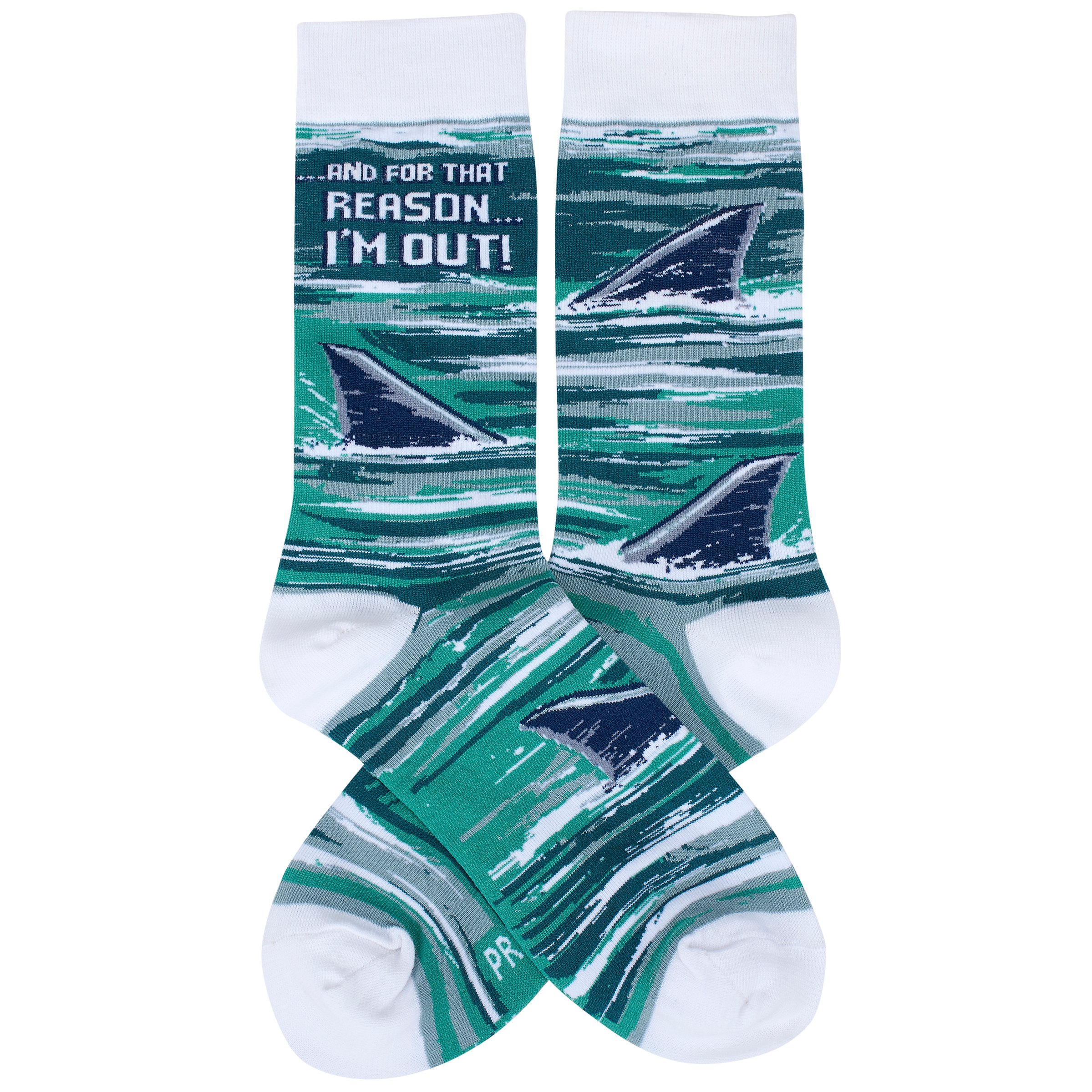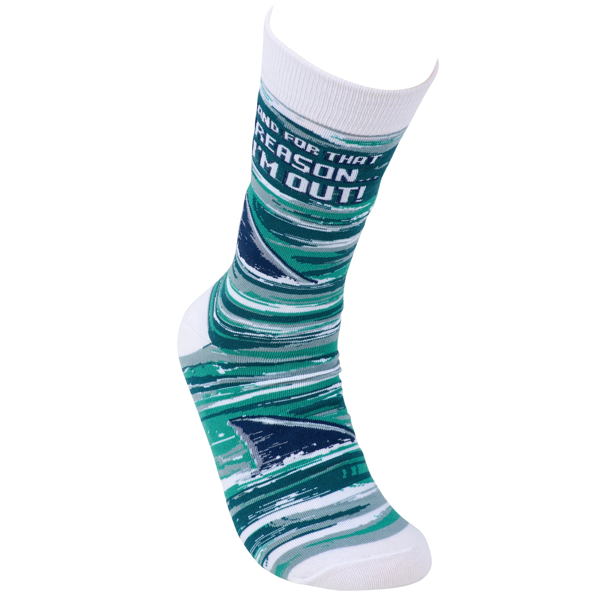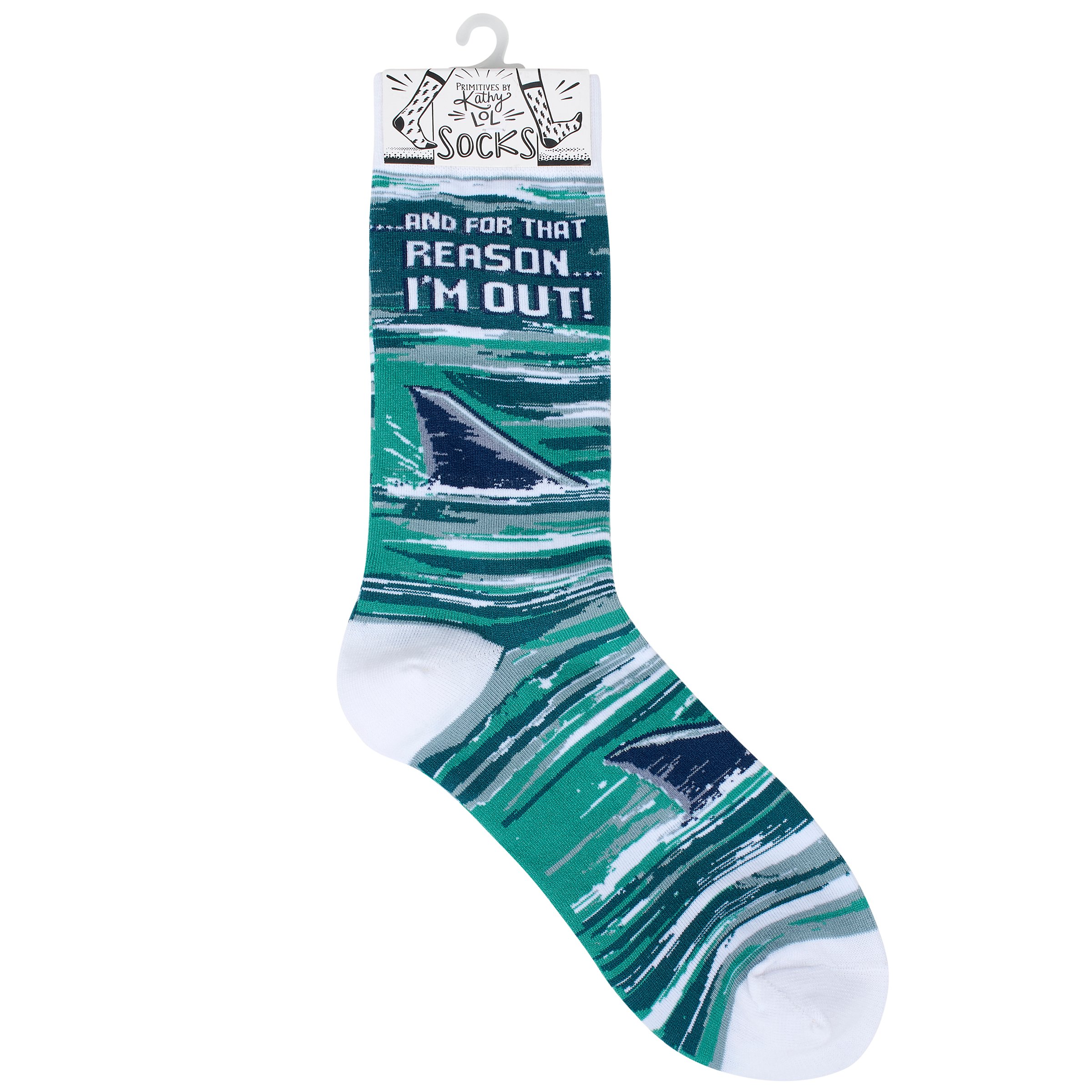 A pair of colorful socks from our LOL-Made You Smile Collection displaying a playful hand illustrated design of shark fins in the ocean with a funny sentiment that reads "...And For That Reason... I'm Out!" These giftable socks are made with a cotton, nylon, and spandex blend for a one size fits most design. Our And For That Reason I'm Out socks come with a decorative header card and a clear plastic hanger for easy rack display and gifting. A fun gift perfect for everyday self-expression.